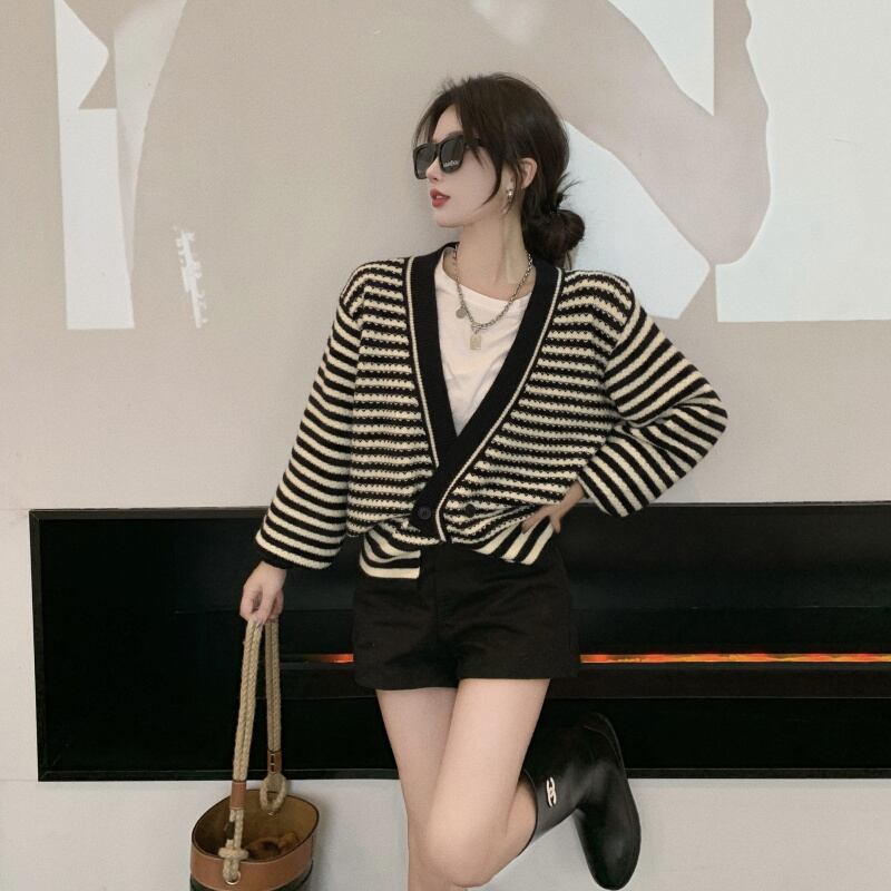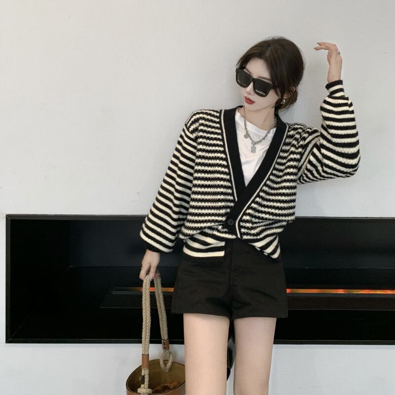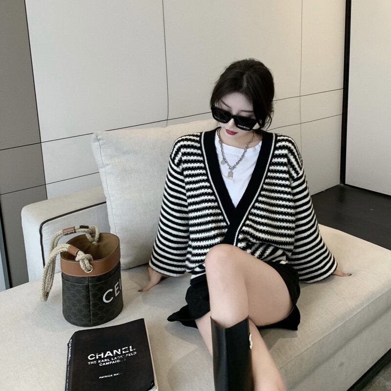 ストライプニットカーディガンオータムスタイルVネックルーズブラウス ロング 秋物 フラワークラフター67923904254