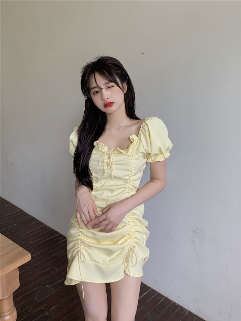 イエロースリーブドレス サマースカート ウェストプリーツ 大人ガーリー スウィート キュート カジュアル 夏物 フラワークラフター1422320941