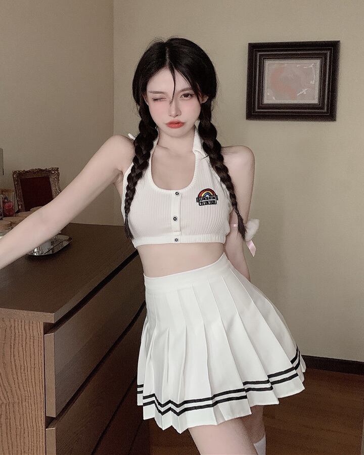色:レインボーホルターシングルピース,白いプリーツスカート