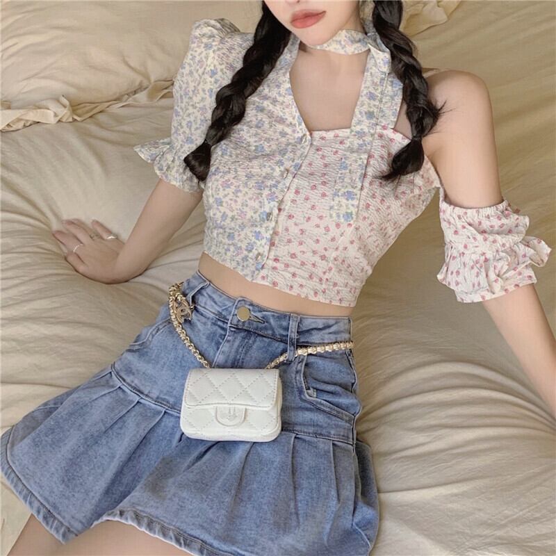 フローラルスリーブシャツ レディースサマーストラップレススリムショートトップス 夏物 花柄 フラワークラフター42835153753