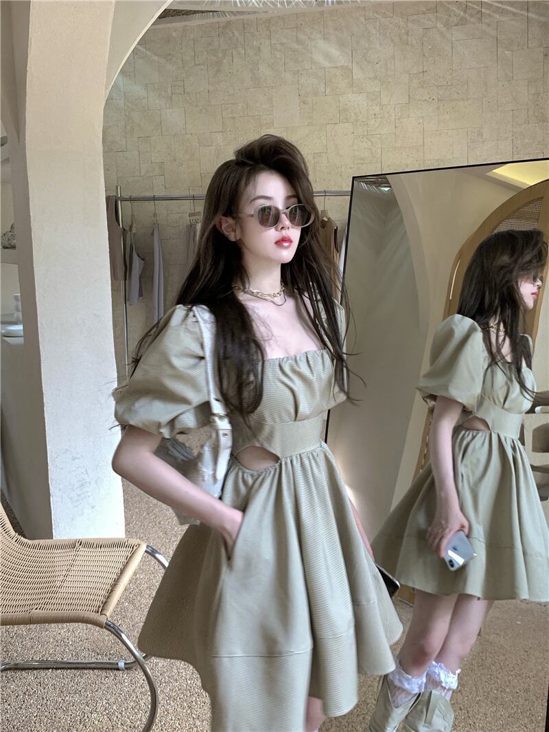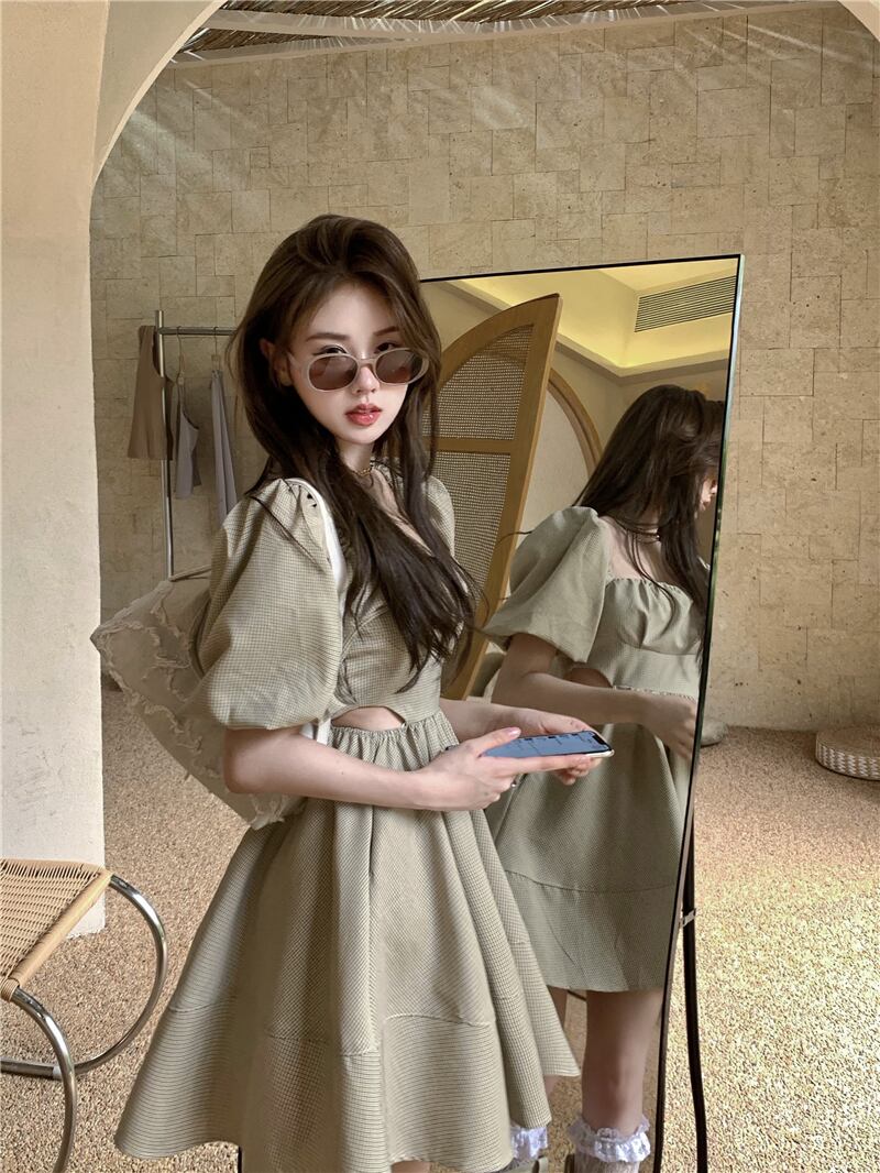 格子柄スリーブドレス サマースタイルカラーウェストショートスカート 夏物 スクウェア フラワークラフター17740721651