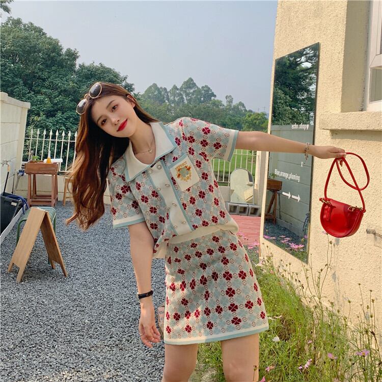 サマージャカードショートニットトップス スカート 夏物 フラワークラフター57164867962