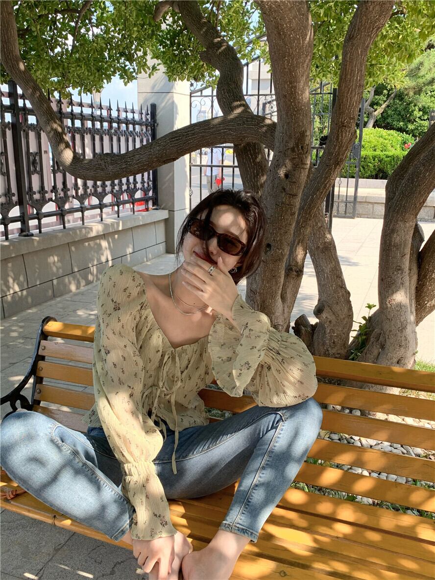 フローラルシフォンシャツ レディースサマー薄手Vネックスリーブショートトップス 夏物 花柄 フラワークラフター36951998077