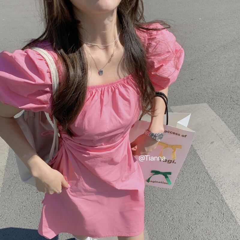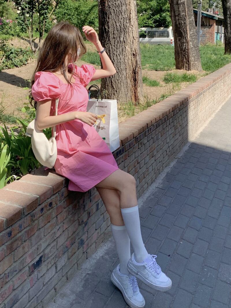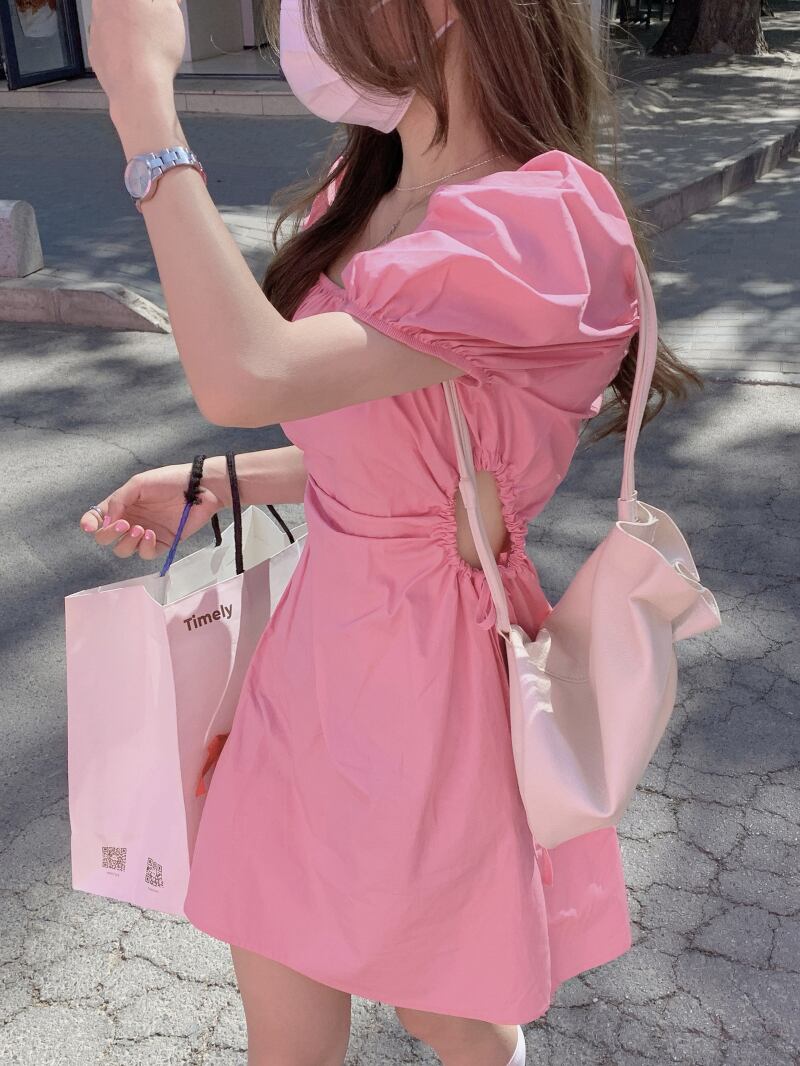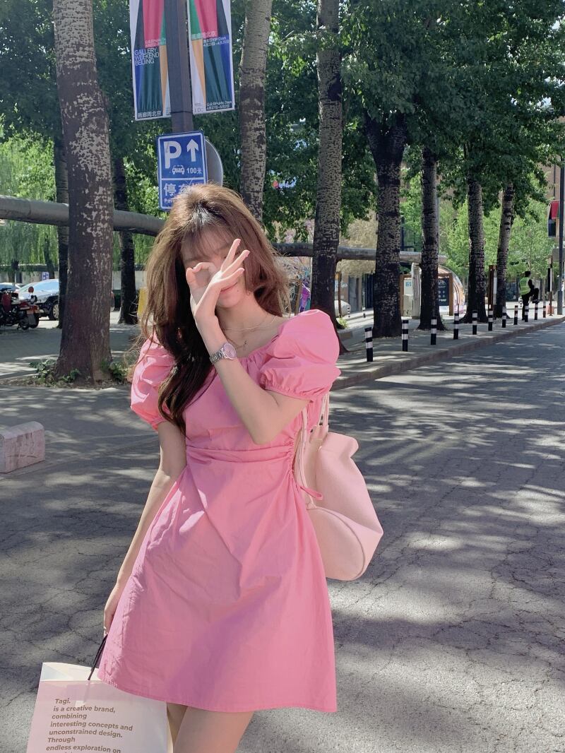スタイルスリーブドレス サマーウェストAラインスカート ピンク 夏物 スクウェア フラワークラフター69023318573
