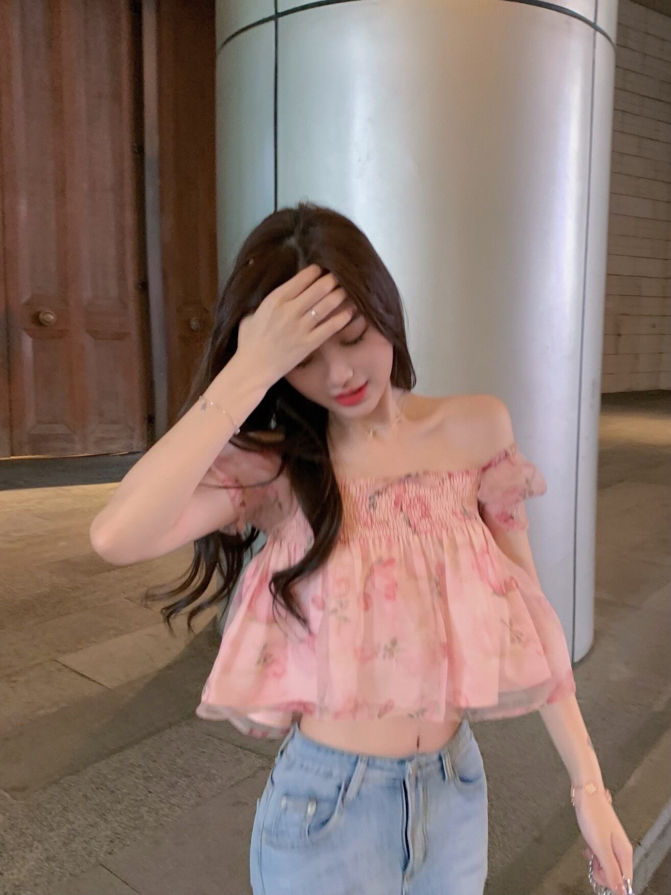 フローラルシフォンシャツ レディースサマースリーブスリムフィットショートトップス 夏物 花柄 フラワークラフター41464450281