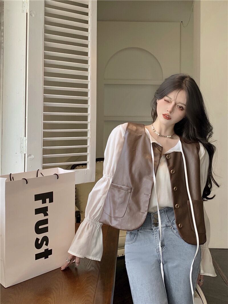 カーキレザージャケット サマースタイルルーズノースリーブショートトップス 夏物 フラワークラフター6429012243