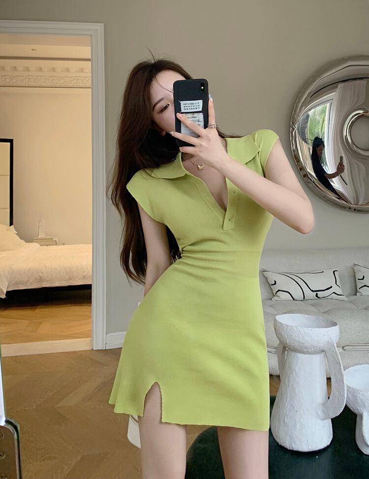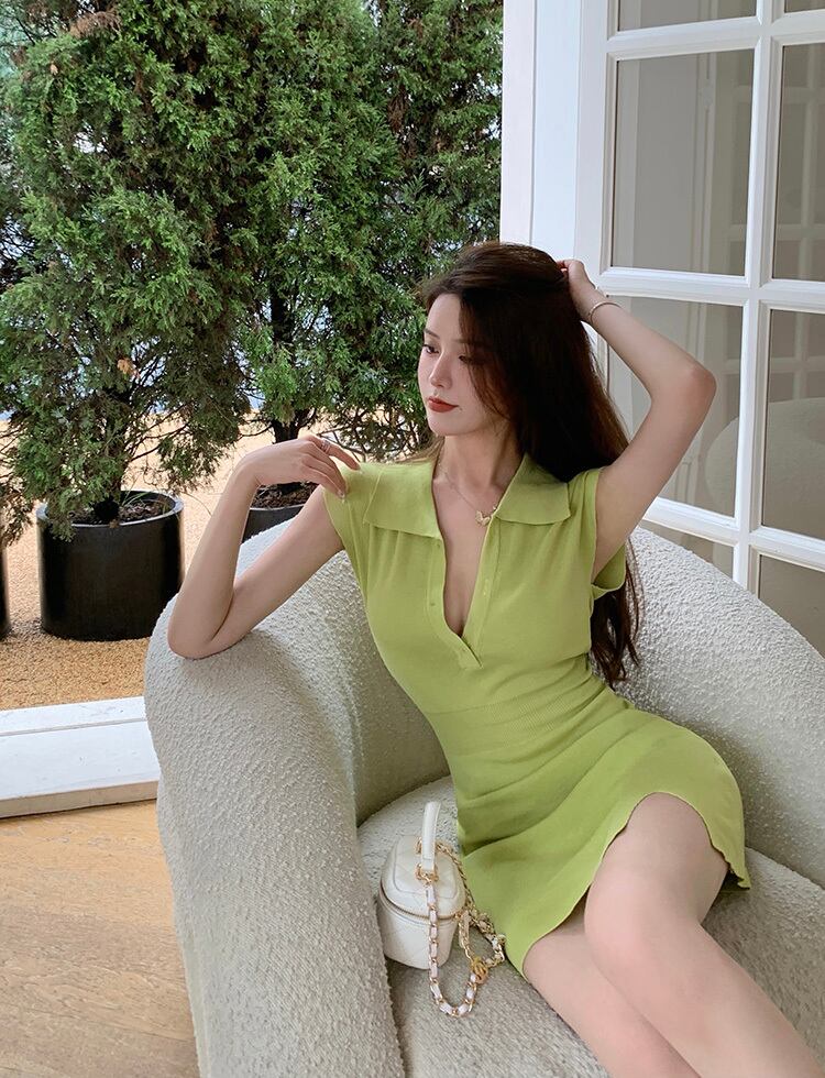 グリーンカラーノースリーブニットドレス サマーウェストショートスカート 夏物 フラワークラフター3399168195