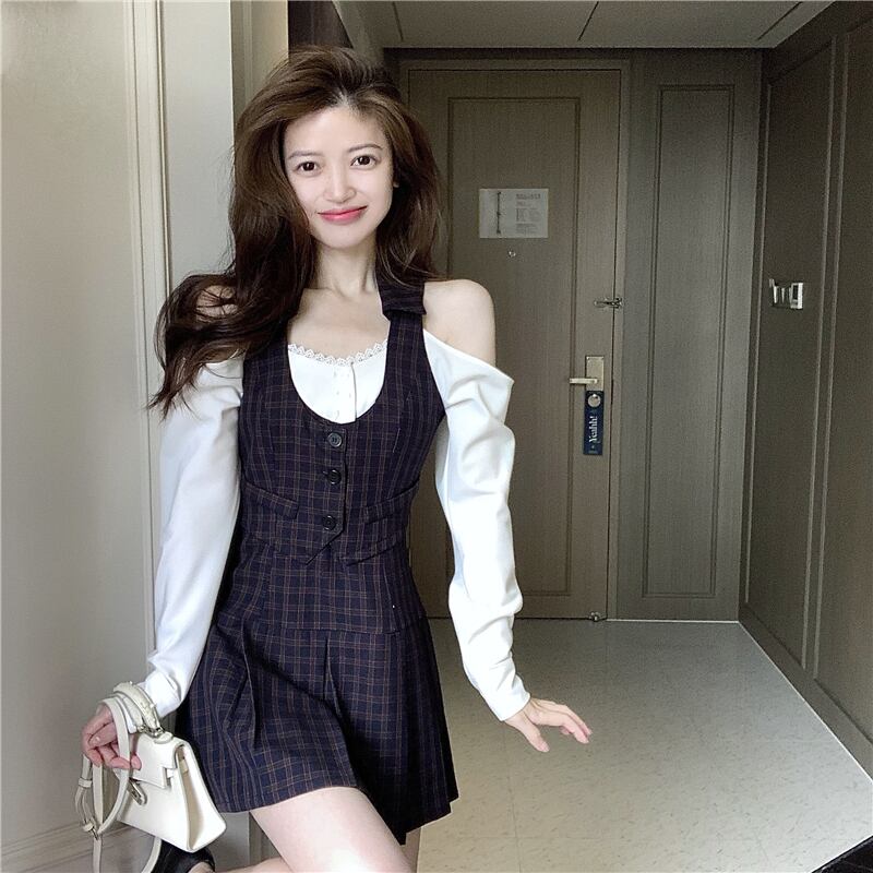 スタンダード格子柄ドレス スプリングオータムウェストプリーツスカート ロング レトロ 春物 秋物 フラワークラフター21330772925