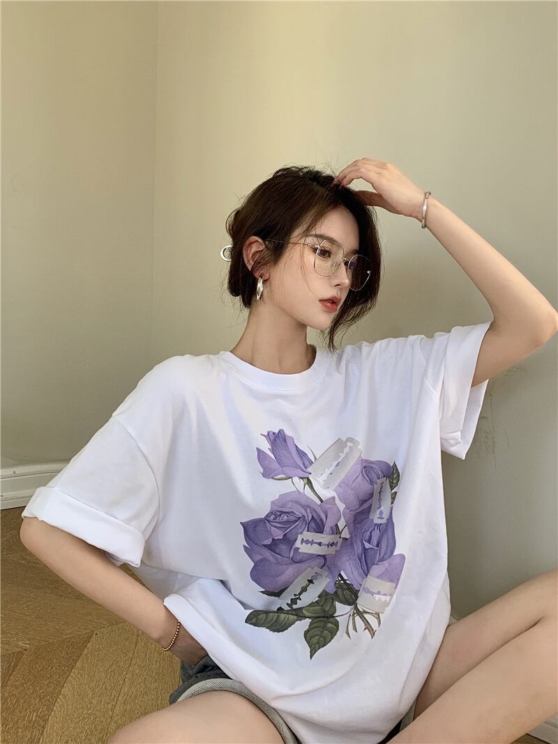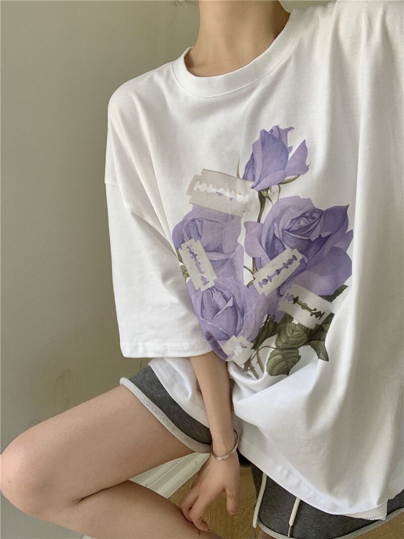 レッドFlowerデザイン Tシャツ サマールーズロングトップス ドレス 夏物 フラワーデザイン フラワークラフター60844145502