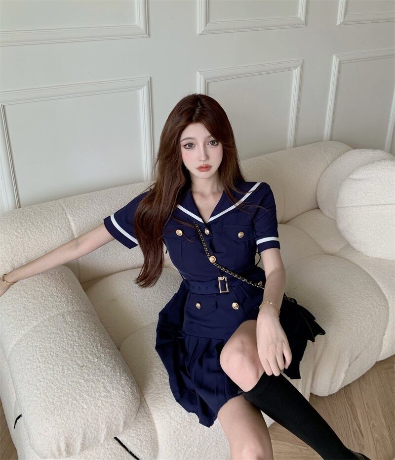 スタイルネイビーカラードレス サマーウェスト薄手Aラインプリーツスカート 夏物 フラワークラフター44366672924