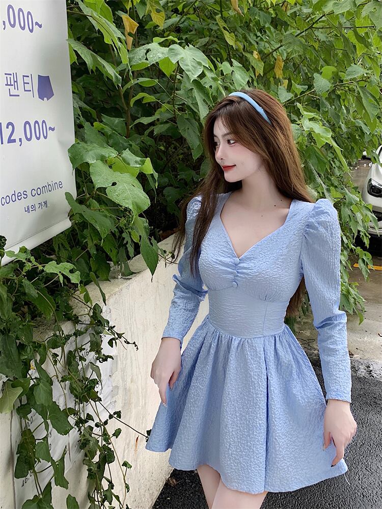 ブルードレス スプリングオータムVネックウェスト薄手Aラインショートスカート ロング 春物 秋物 フラワークラフター51017118236