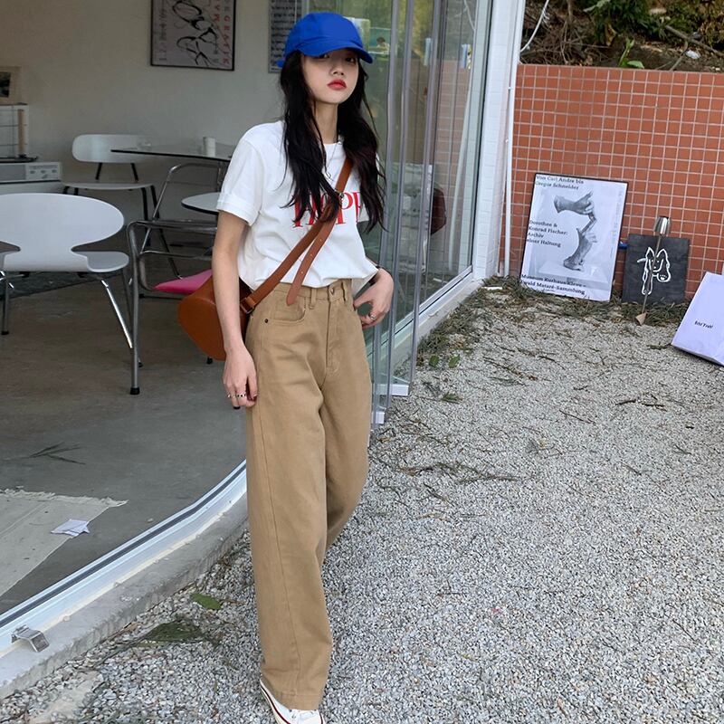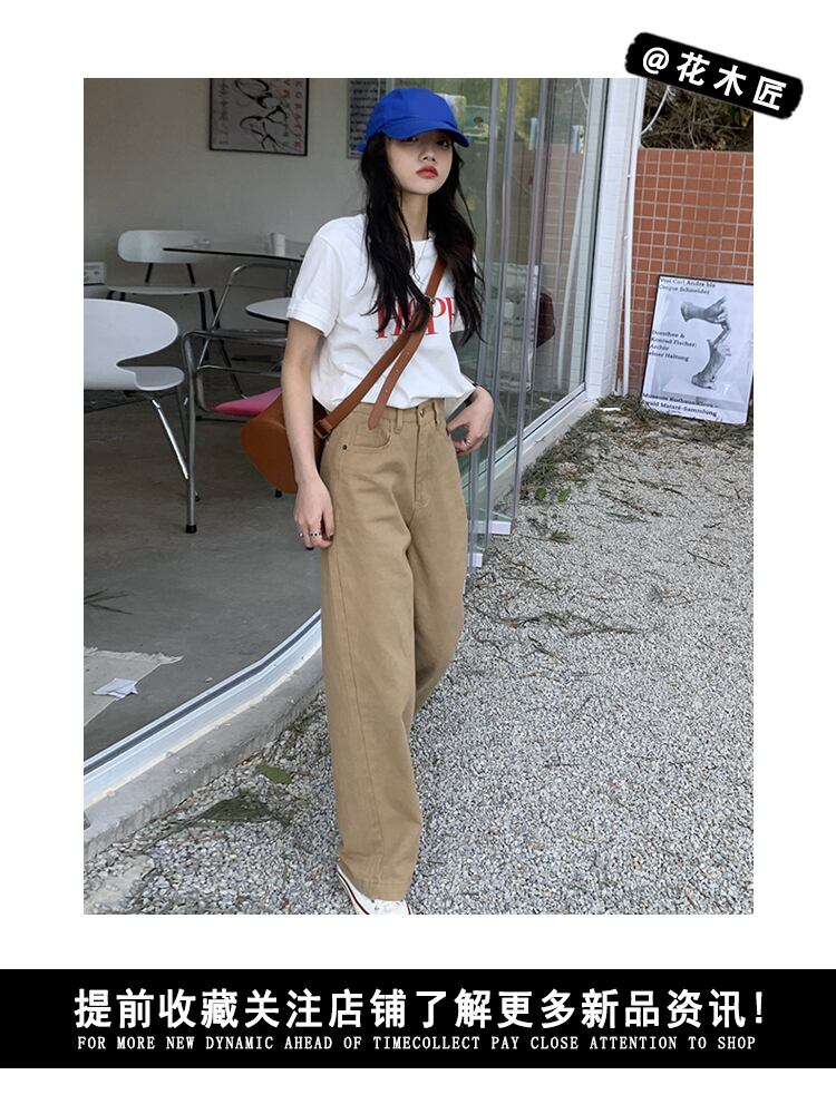スタンダードカーキジーンズ ルーズワイドレッグパンツ スプリングオータムウェストロング レトロ 春物 秋物 ワイドパンツ フラワークラフター86046425086