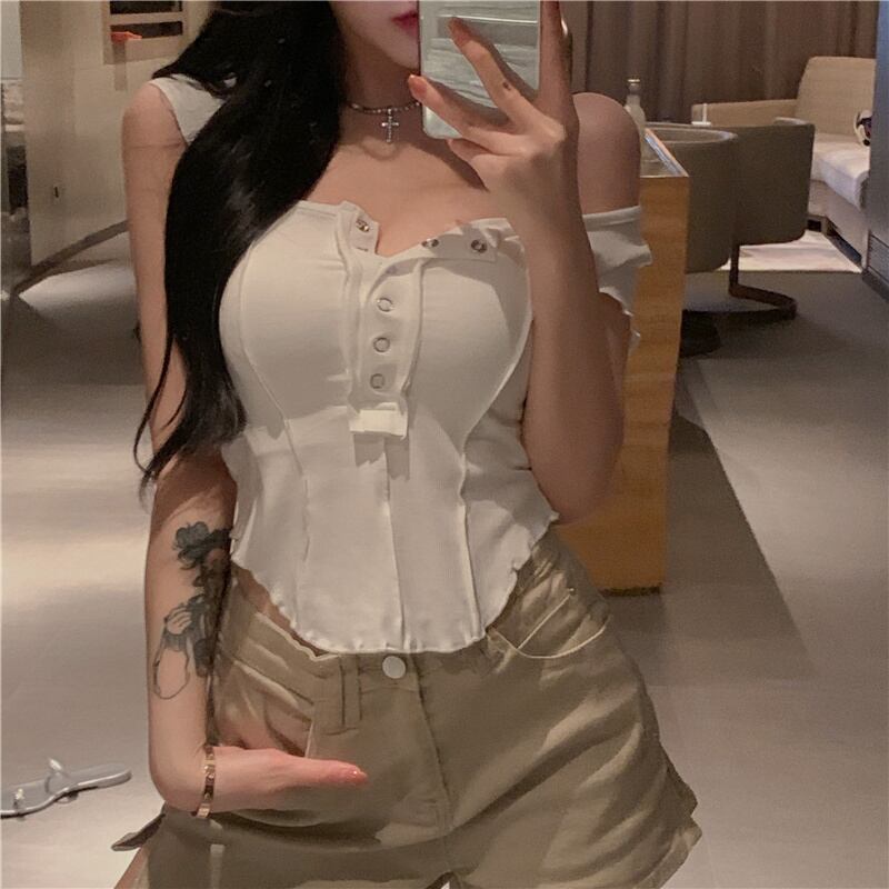 ホワイトショートTシャツ サマースタイルボタンスリムトップス 夏物 フラワークラフター52029781340