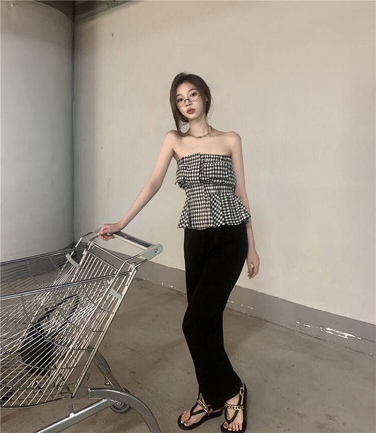 格子柄トップス ストラップレスサマーショートバックドレス 夏物 フラワークラフター2582177269