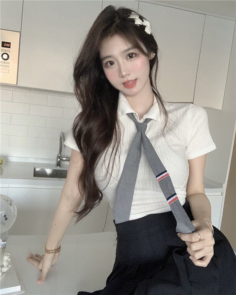 色:グレーのユニムシングルピース,白いユニムの単一の部分,ブラックプリーツスカート,グレープリーツスカート