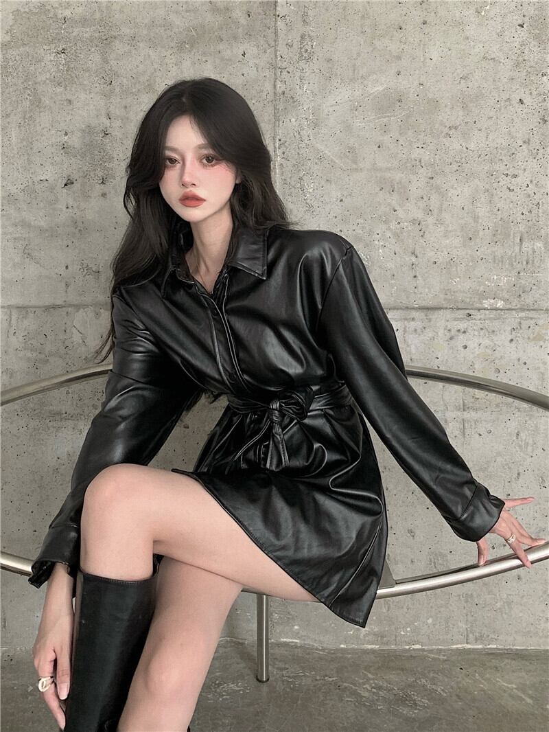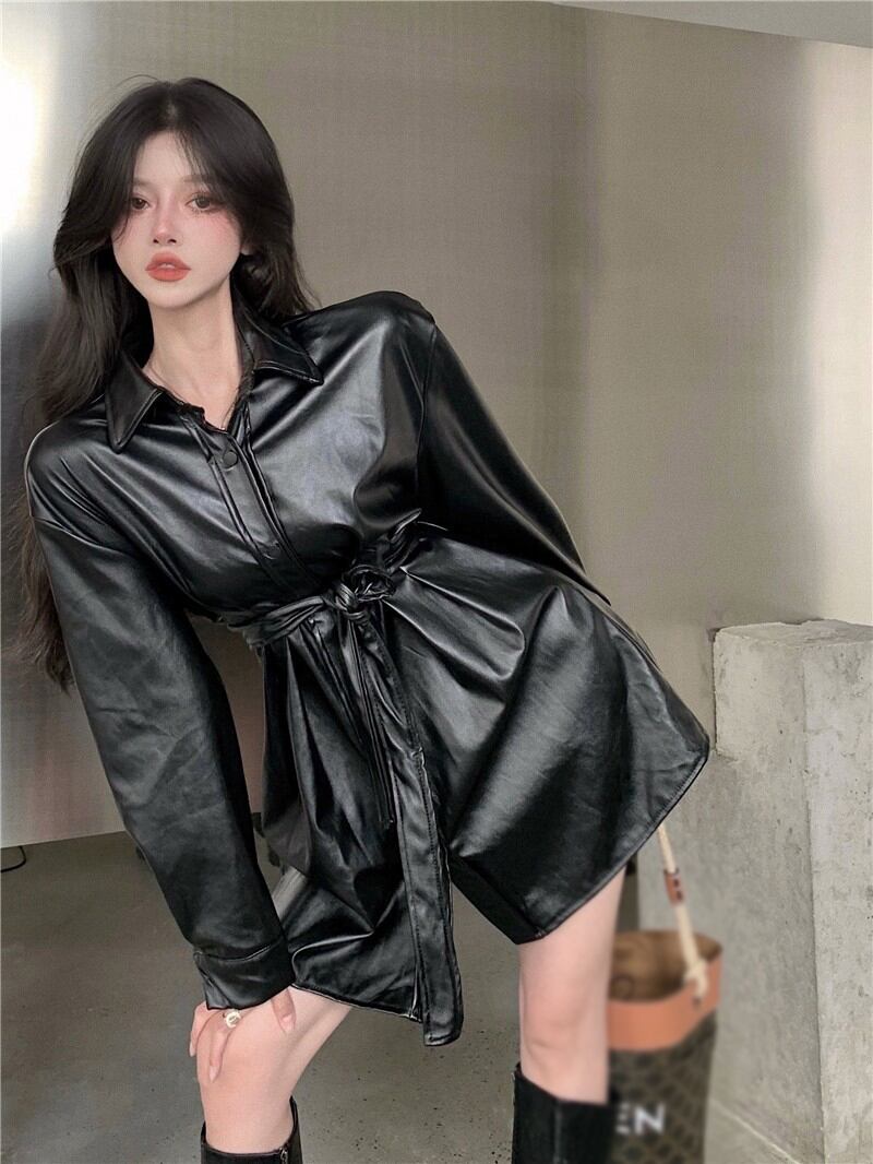 ブラックレザージャケット スプリングオータムレッドルーズトップス ロング 春物 秋物 フラワークラフター6885564550
