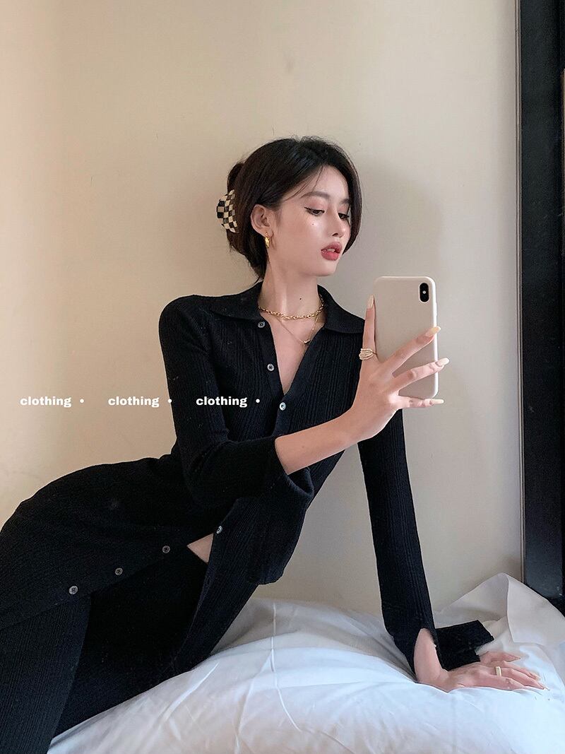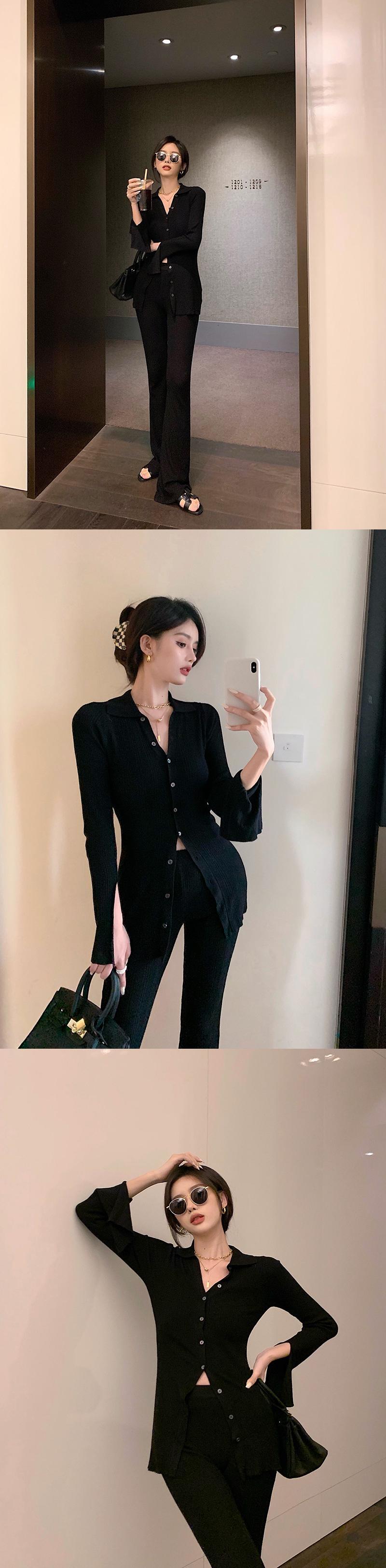 ブラックニットカーディガンオータムカラースリムトップス ロング 秋物 フラワークラフター64510694193