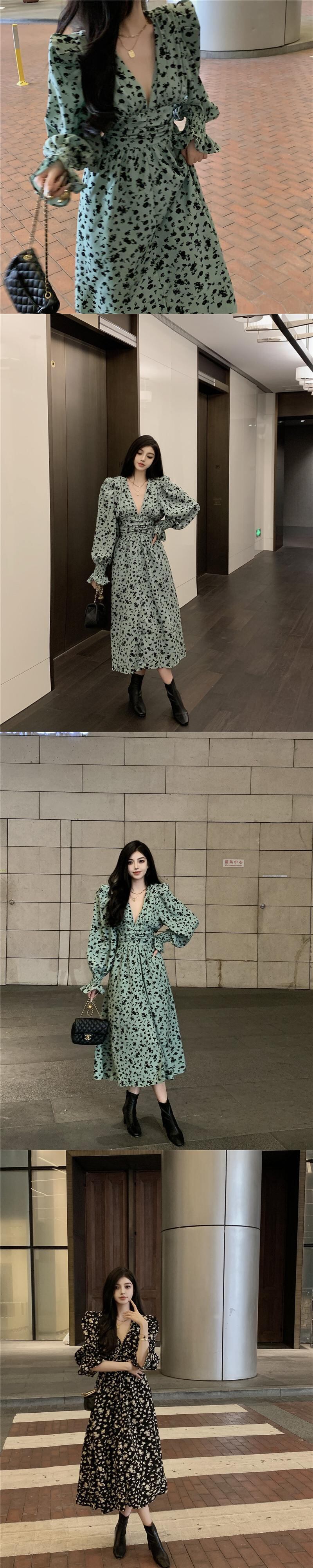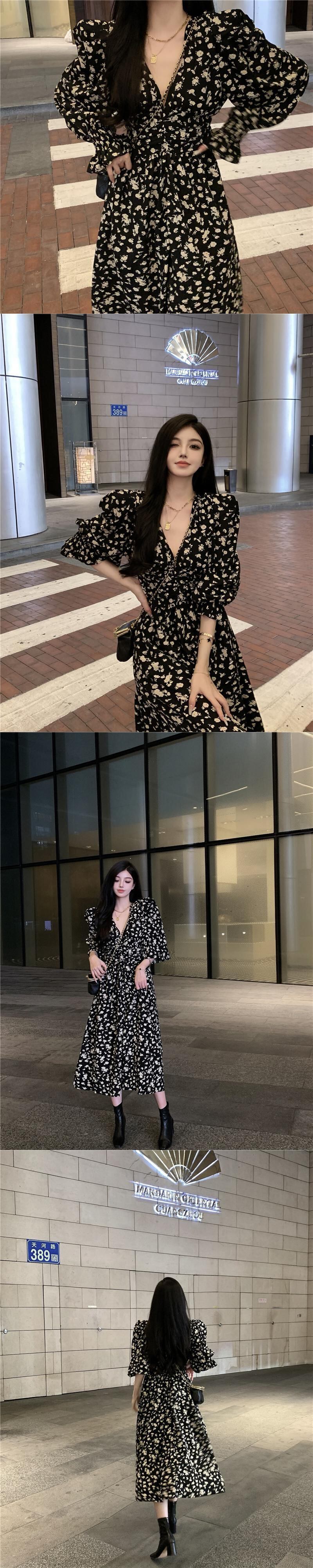 スタンダードフローラルスリーブドレス スプリングオータムVネックウェストAラインスカート レトロ 春物 秋物 花柄 フラワークラフター85210828843