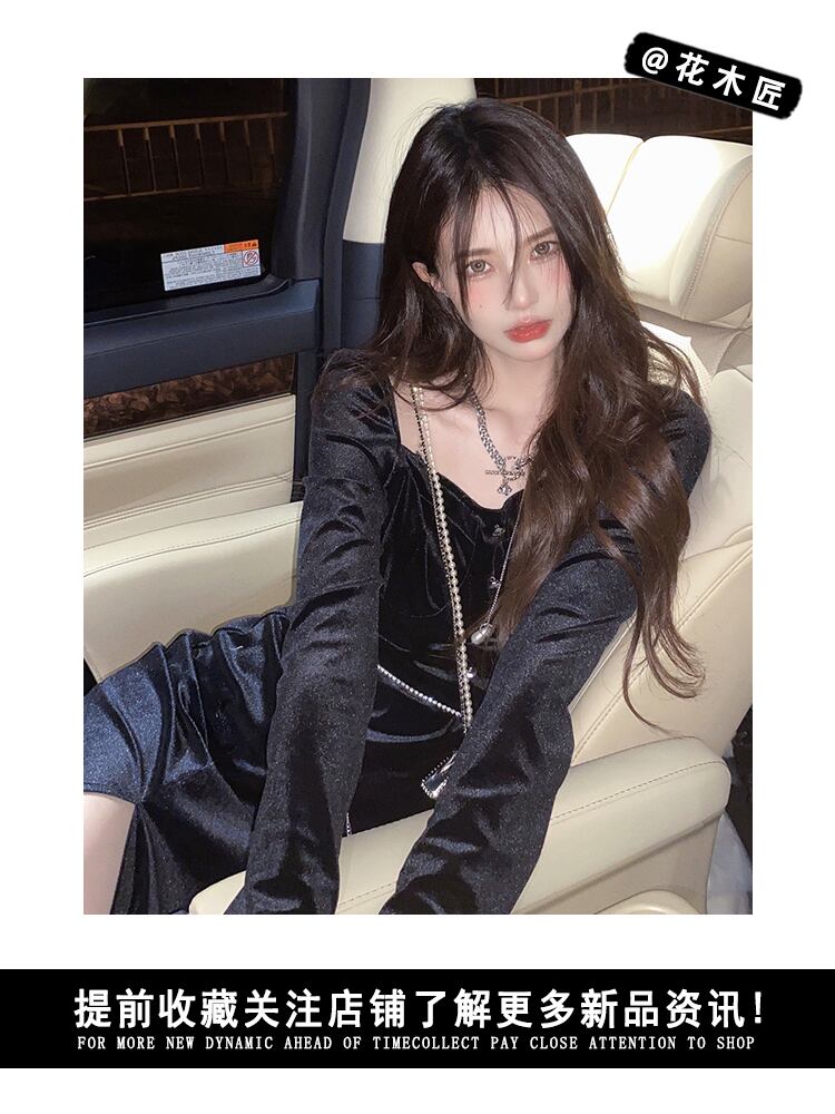 ブラックベルベットドレス スプリングオータムスタイルウェスト薄手Aラインスカート ロング 春物 秋物 フラワークラフター21819566577