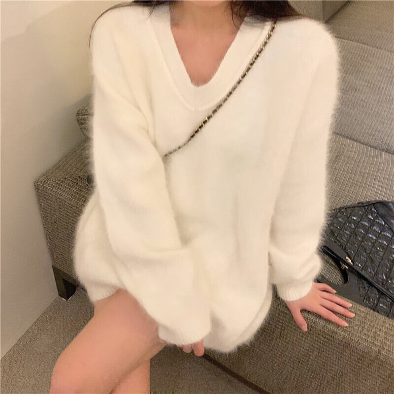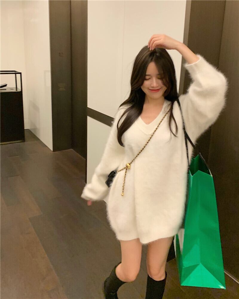 ホワイトVネックセーター オータムレッドスタイルルーズトップス ロング 秋物 フラワークラフター88660077487
