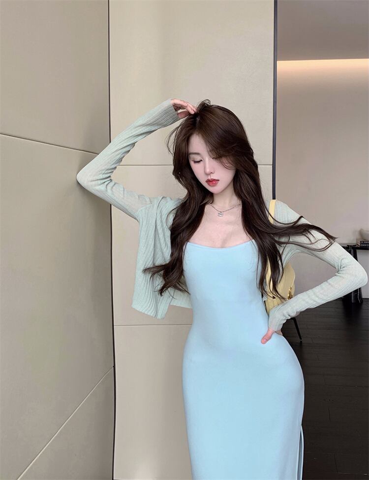 色:ミスティグリーンのサスペンダースカート,ミストグリーンカーディガン