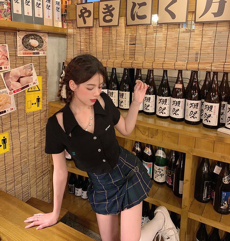 ブラックショートシャツ サマースリム薄手トップス 夏物 オフショルダー フラワークラフター25148766156