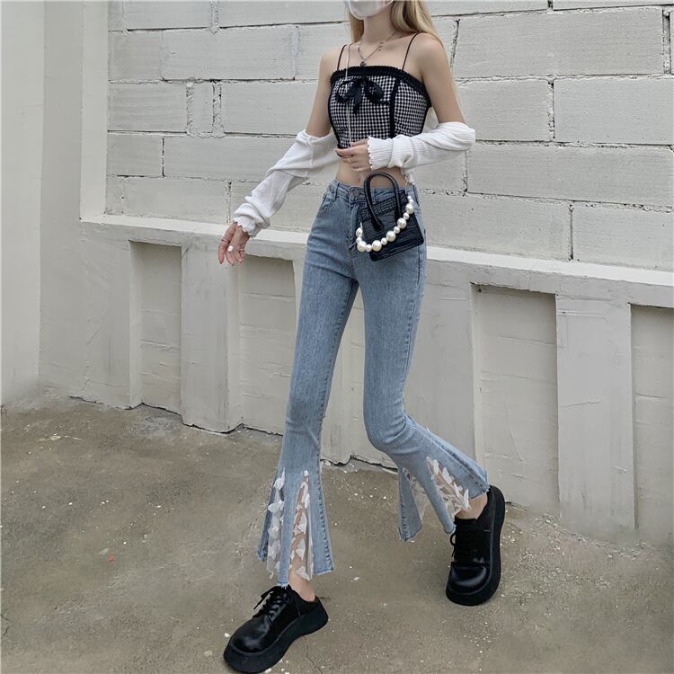 ブルーハイウェストウェストジーンズ レディースサマーメッシュレッドパンツ 夏物 ステッチ フラワークラフター37013857289
