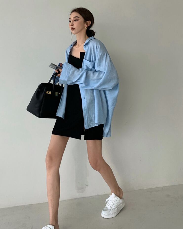 ブルーシャツ サマースタイルルーズトップス ロング 夏物 フラワークラフター73535701238