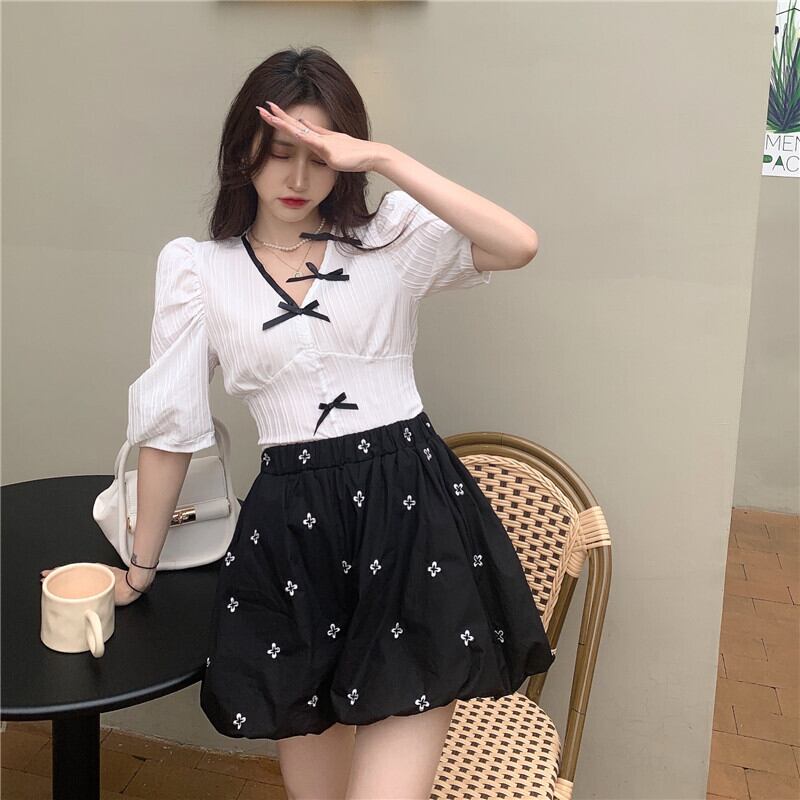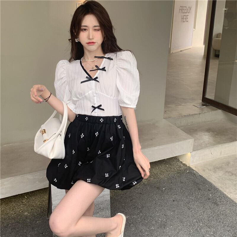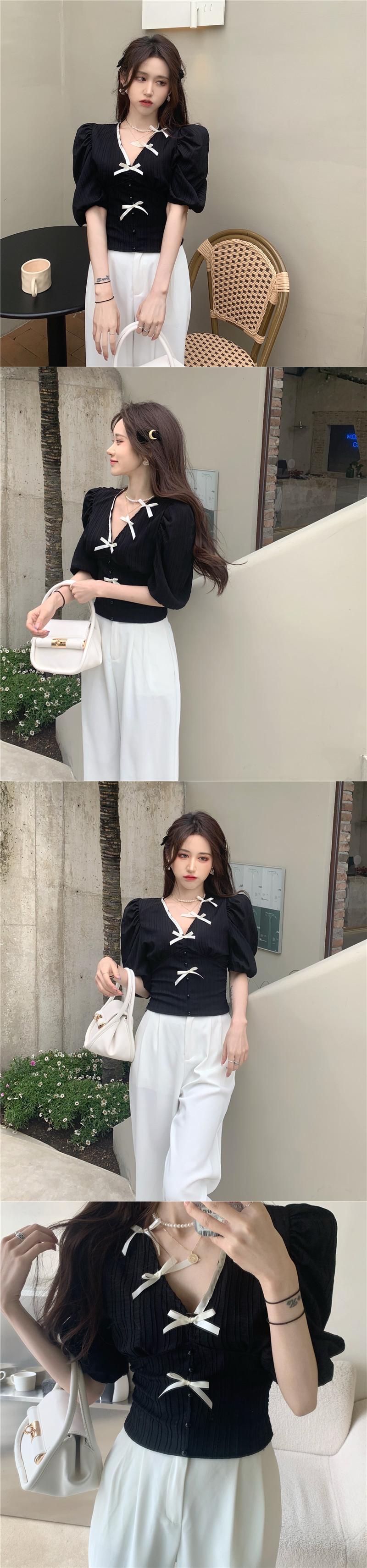ホワイトシャツ サマーリボンスリムショートトップス 夏物 フラワークラフター47256900489