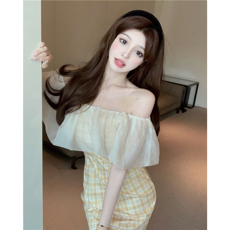 イエロー格子柄ドレス サマーメッシュウェストストラップレススカート 夏物 ステッチ フラワークラフター54277811744