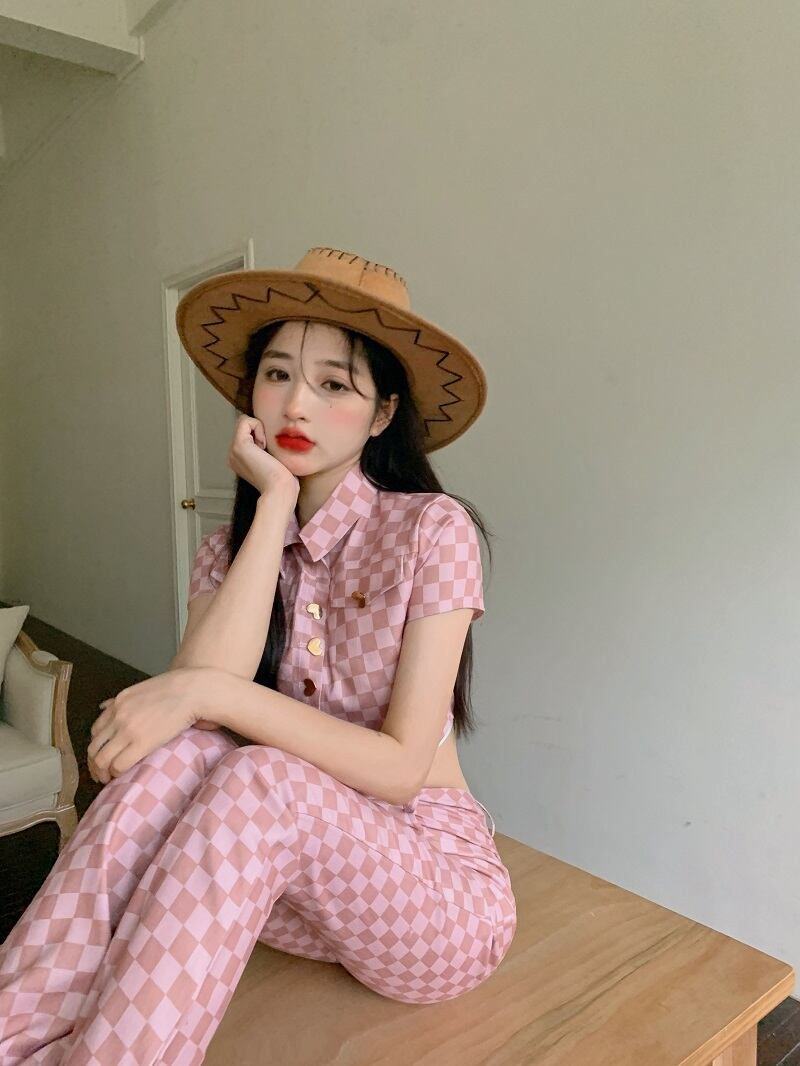 サマースタンダード格子柄トップス スカート ピンク レトロ ストリート 夏物 フラワークラフター22419779631