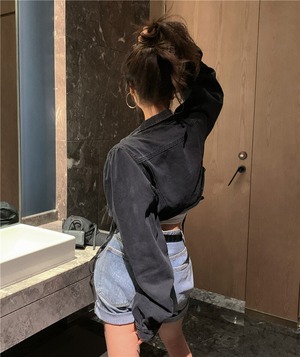 ブラックジャケット スプリングオータムギャザーショートトップス ロング ストリート 春物 秋物 フラワークラフター32927579404