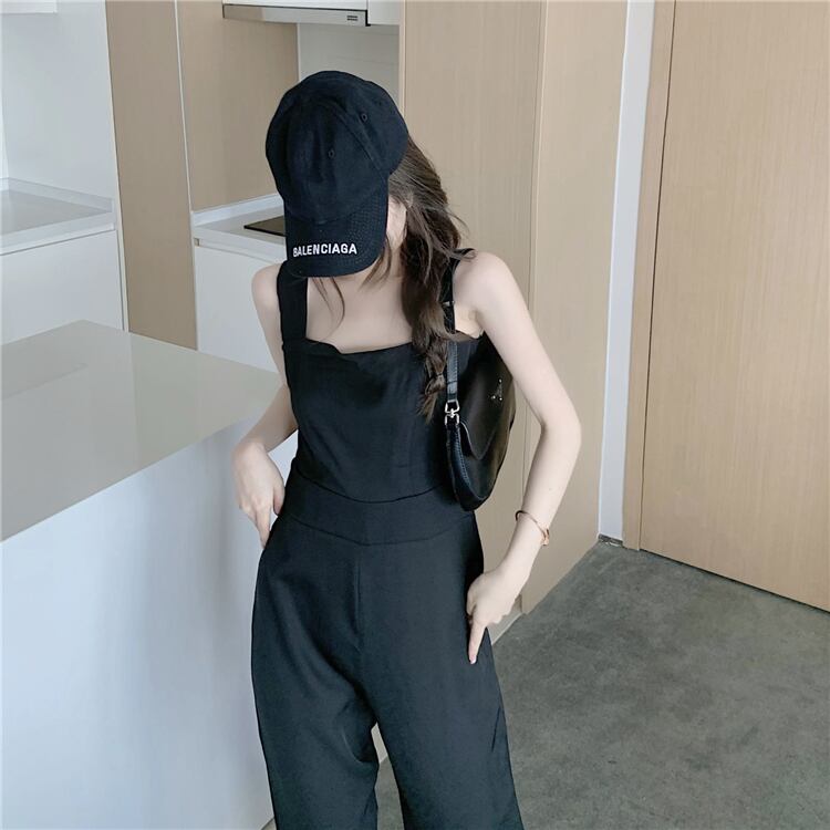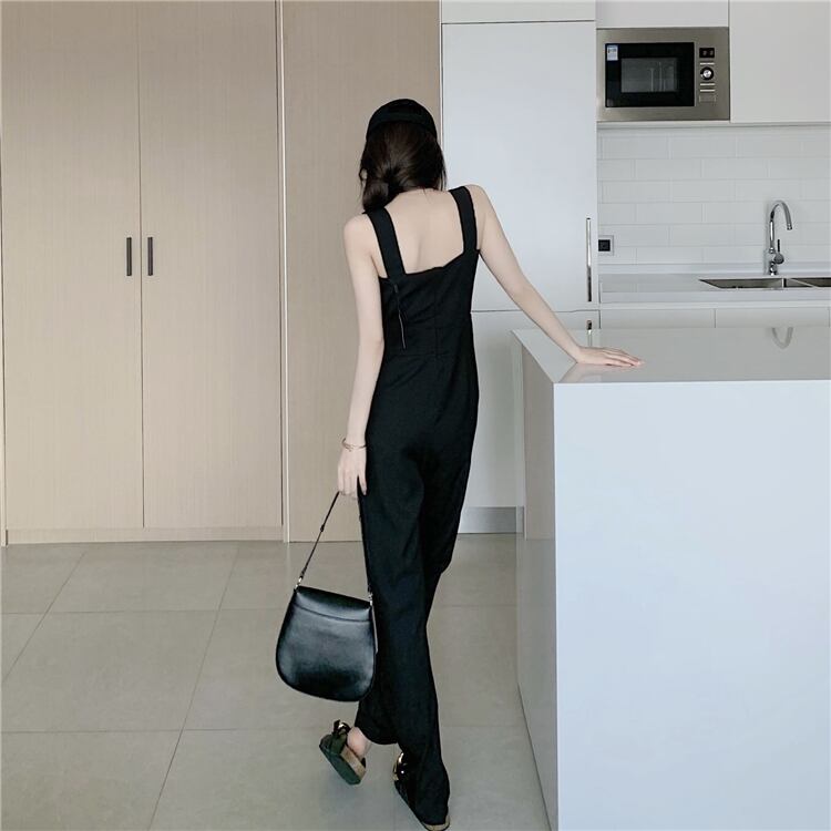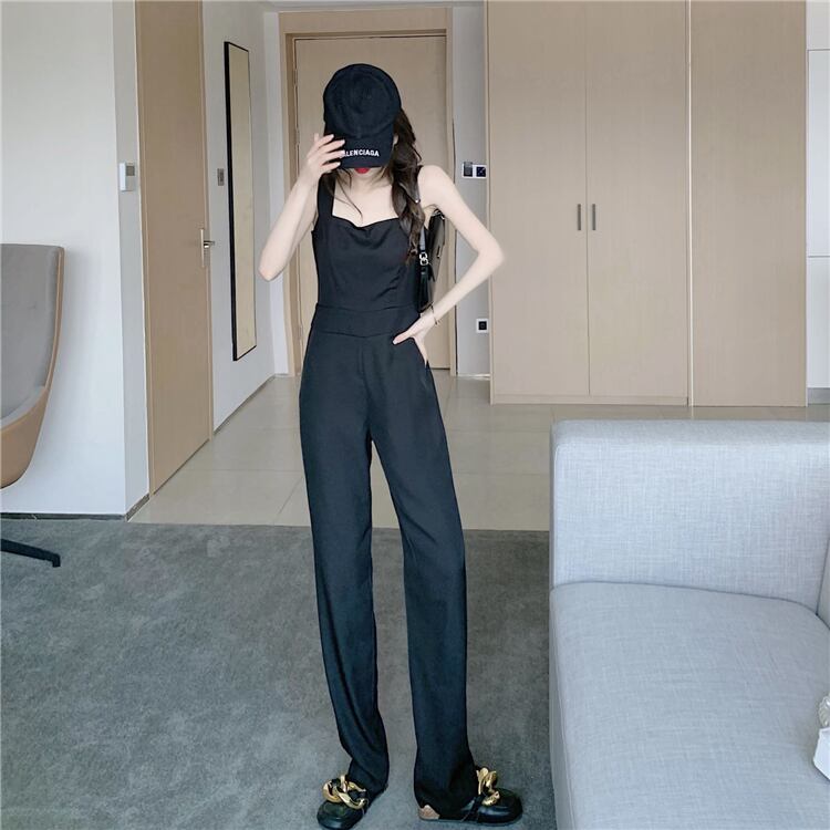 ブラックジャンプスーツ オールインワン サマーレッドオーバーオール ハイウェストウェストスリムルーズパンツ 夏物 フラワークラフター358928349