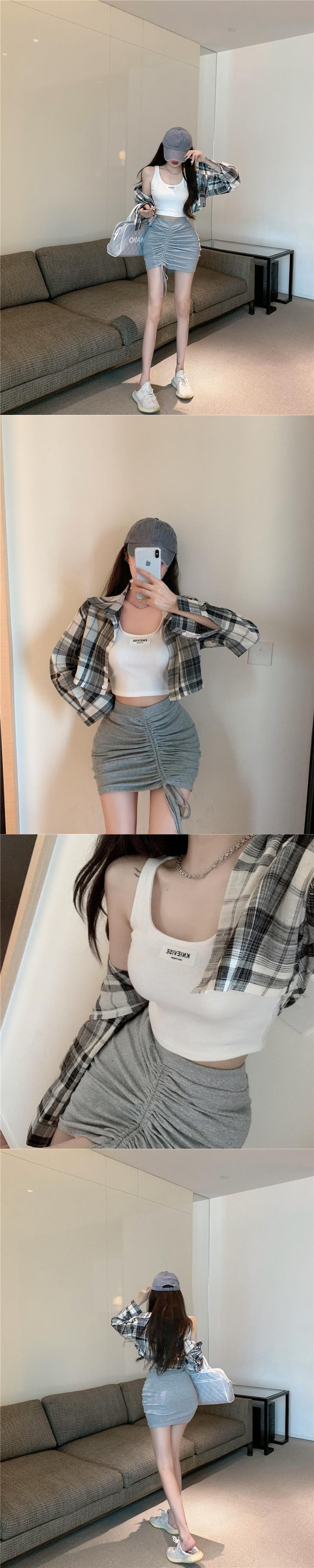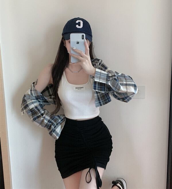 色:白いベストワンピース,青いシャツワンピース,グレーのシャツワンピース,黒スカート,グレースカート