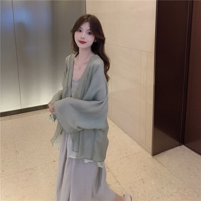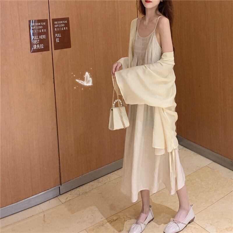 色:アプリコットドレス,アプリコットコートワンピース,グレーグリーンのキャミソール,灰緑色のコート