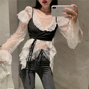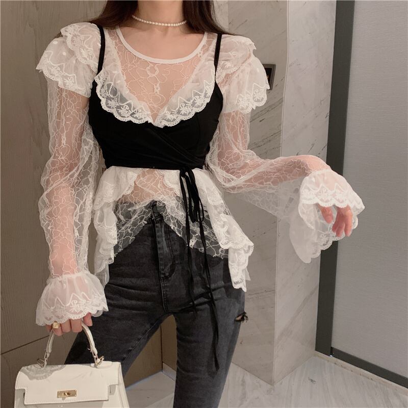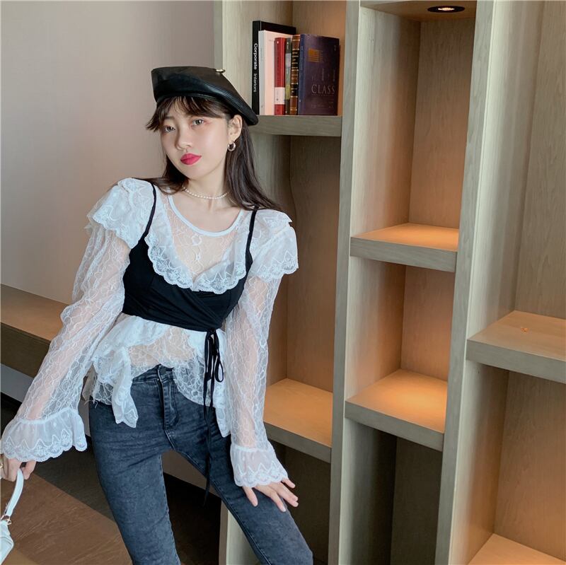 ホワイトレースシャツ スプリングオータム薄手レッドルーズショートトップス 春物 秋物 フラワークラフター59859292235