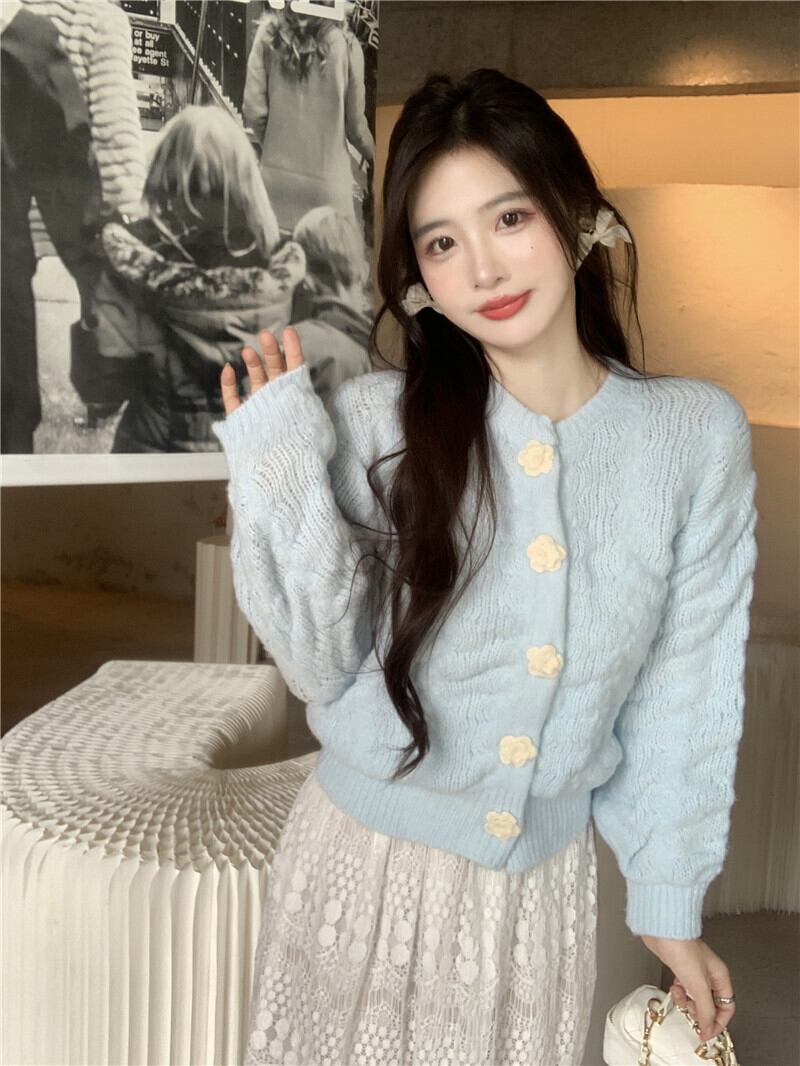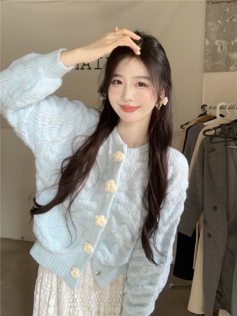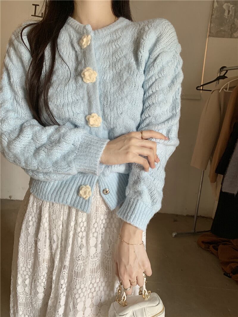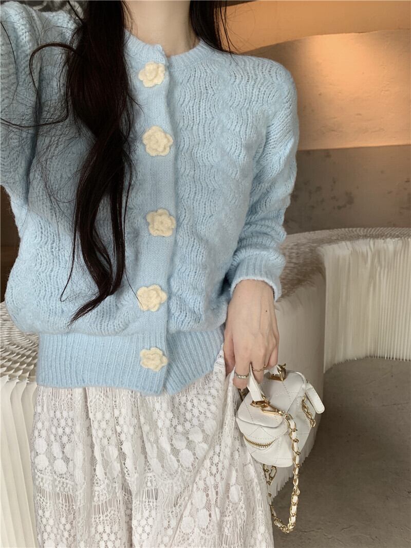 ブルーニットカーディガンオータムスタイルショートトップス ロング 大人ガーリー スウィート キュート カジュアル 秋物 フラワークラフター95182723432