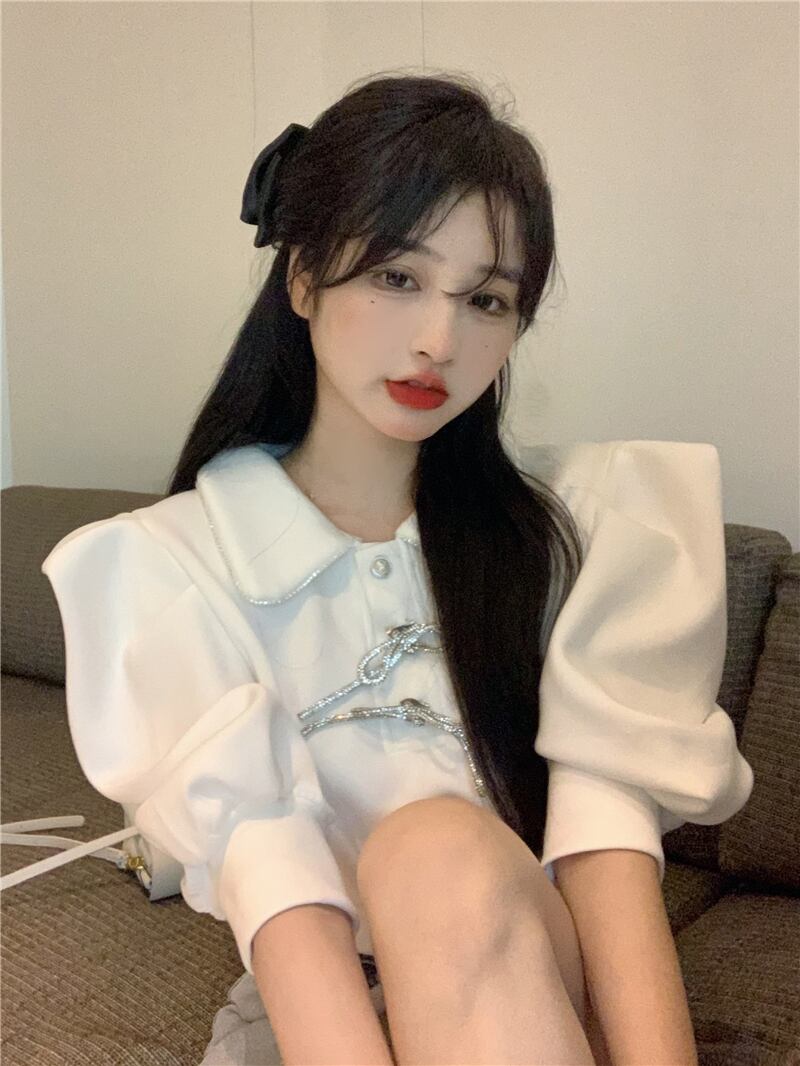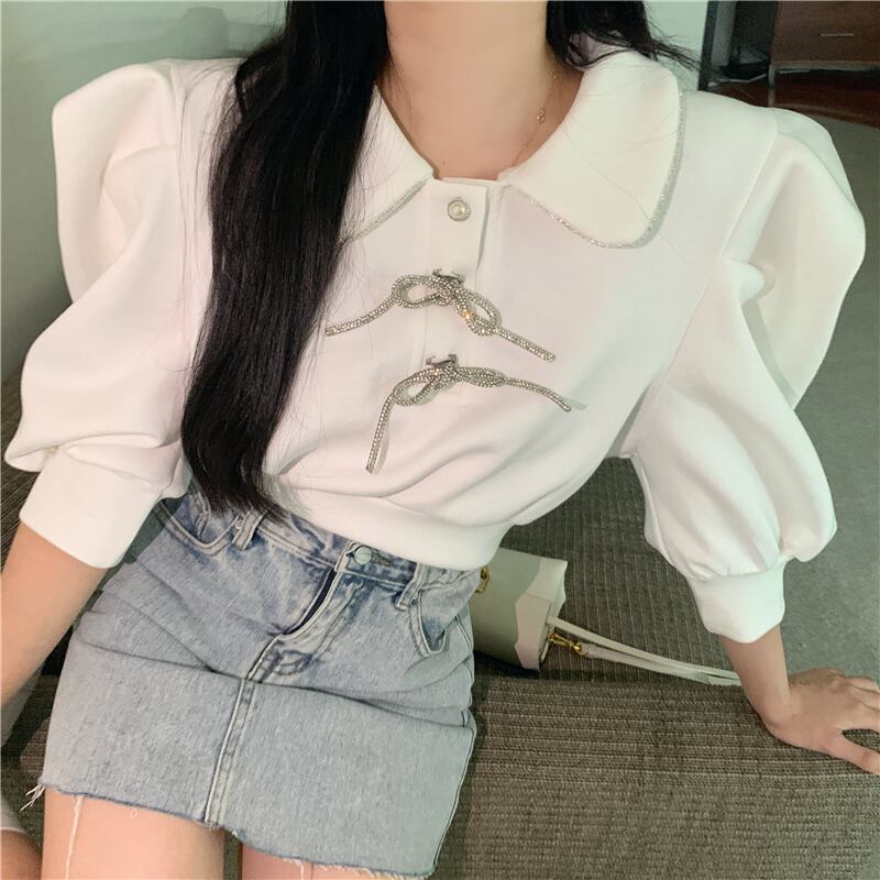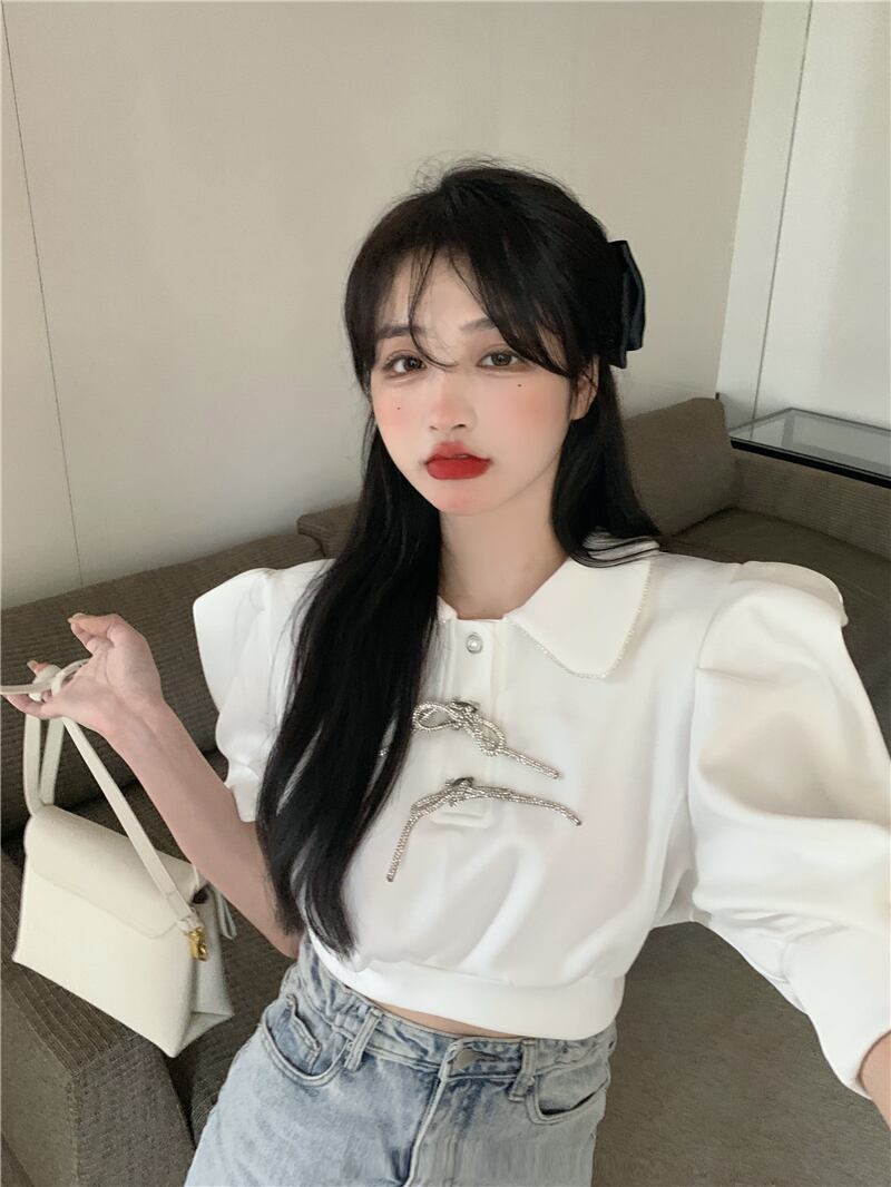 ホワイトカラーシャツ サマースリーブショートトップス リボン 大人ガーリー スウィート キュート カジュアル 夏物 フラワークラフター83937842934