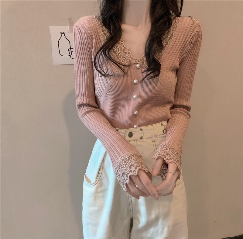 Vネックシャツ スプリングスリムセーター スタイル ロング レース 春物 フラワークラフター18005305430