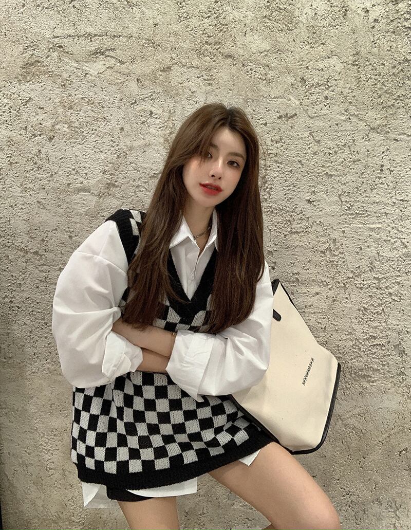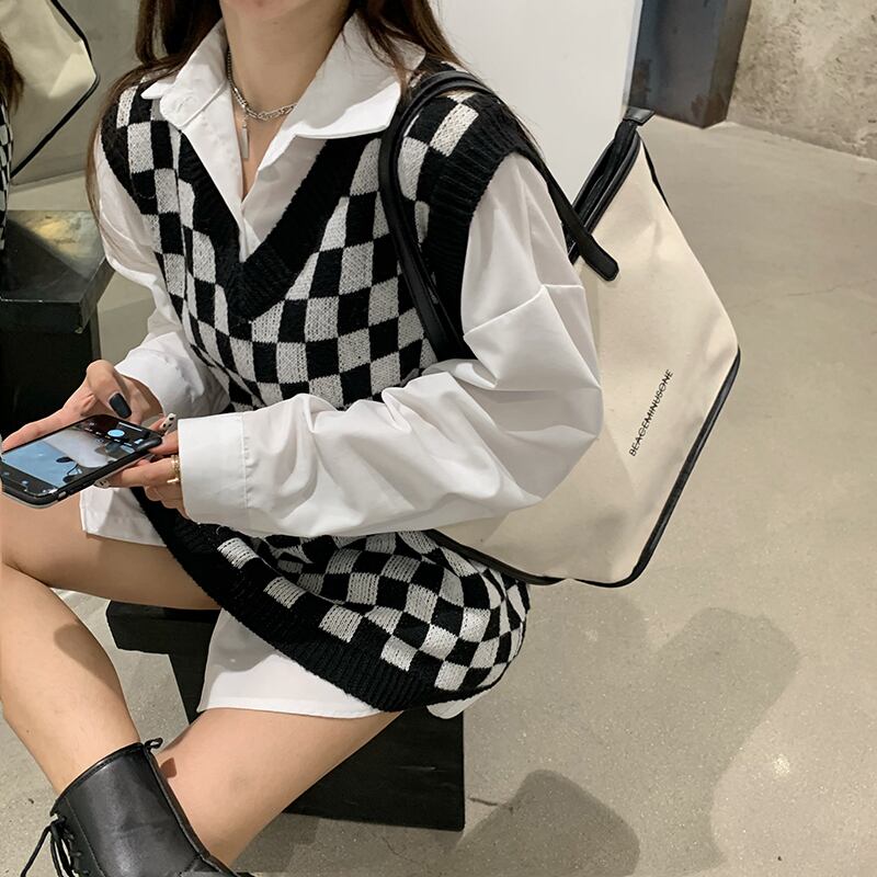 格子柄ニットスプリングオータムカジュアルルーズノースリーブ 春物 秋物 フラワークラフター2967961283