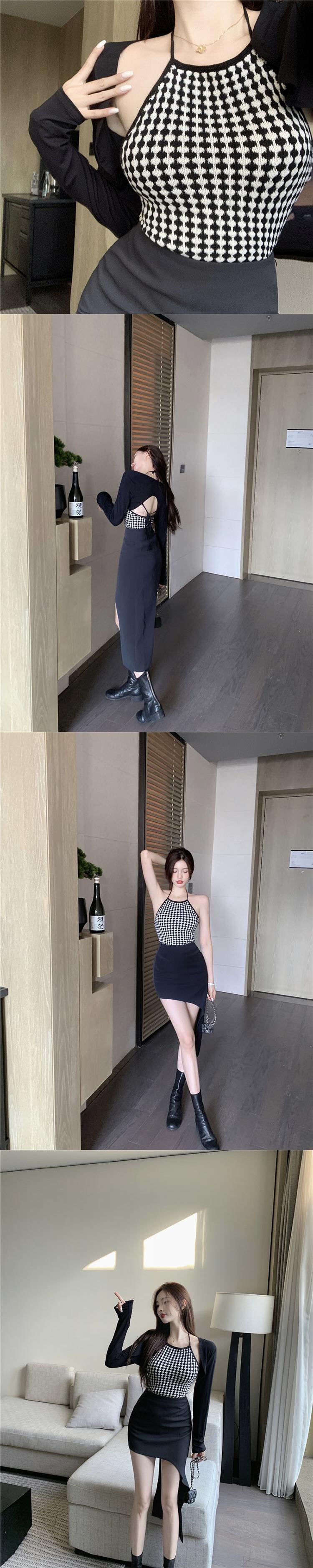 格子柄ホルターサマーバックスリムフィットショートトップス 夏物 フラワークラフター26516009280