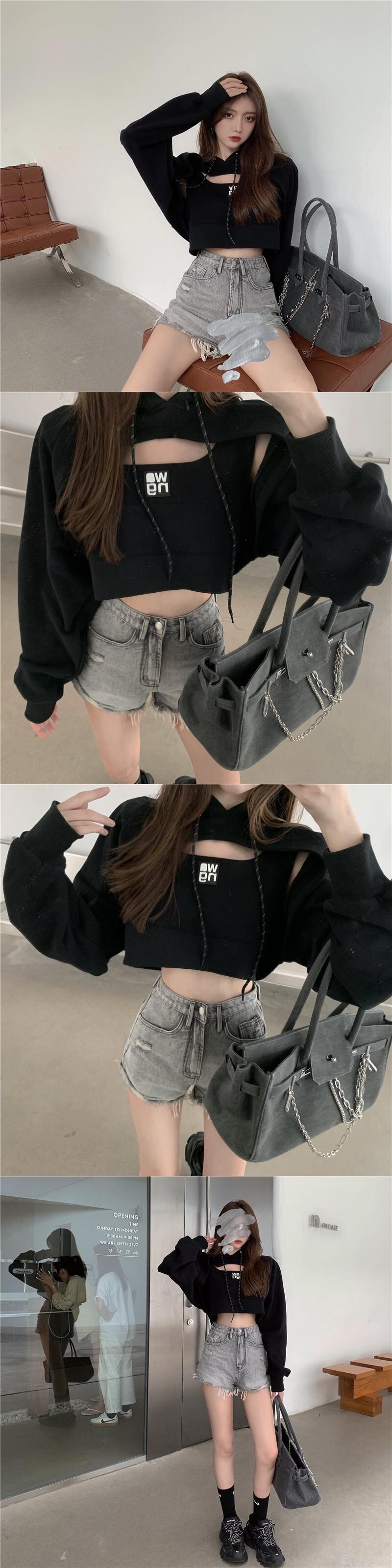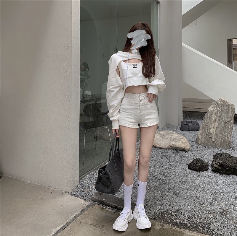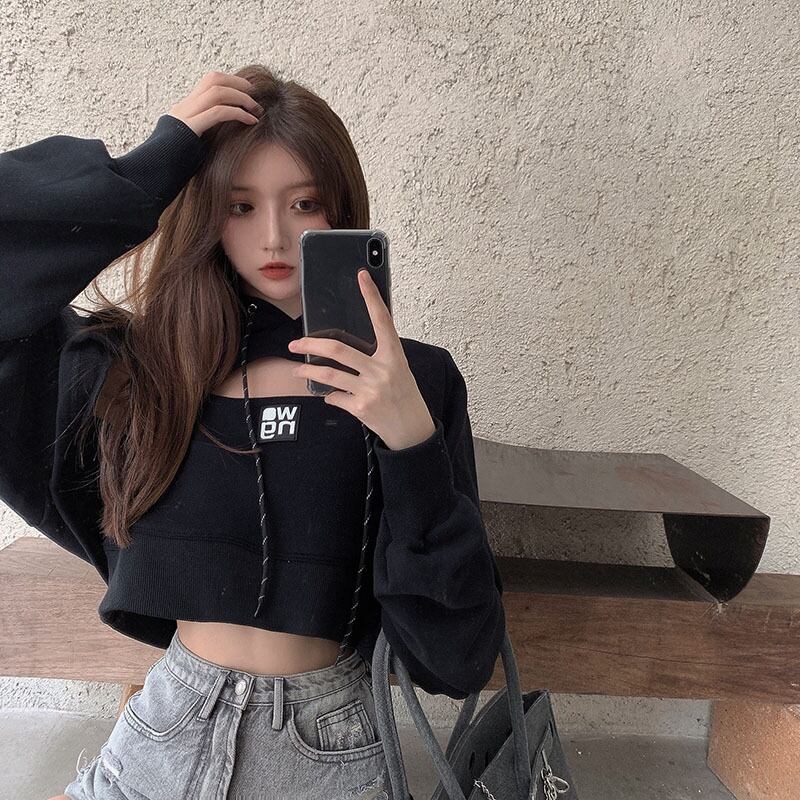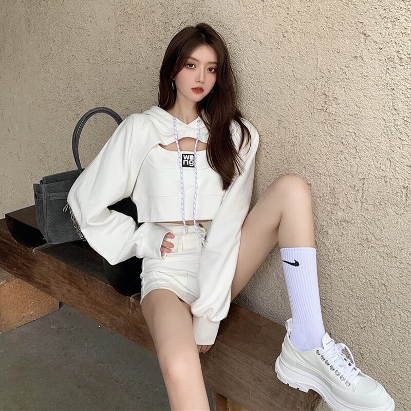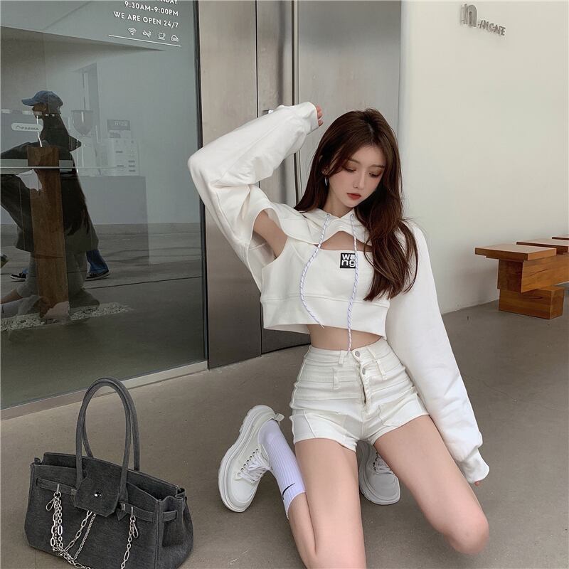 ホワイトセーター オータムカジュアルクロップドショートフードトップス 秋物 ステッチ フラワークラフター83193497175