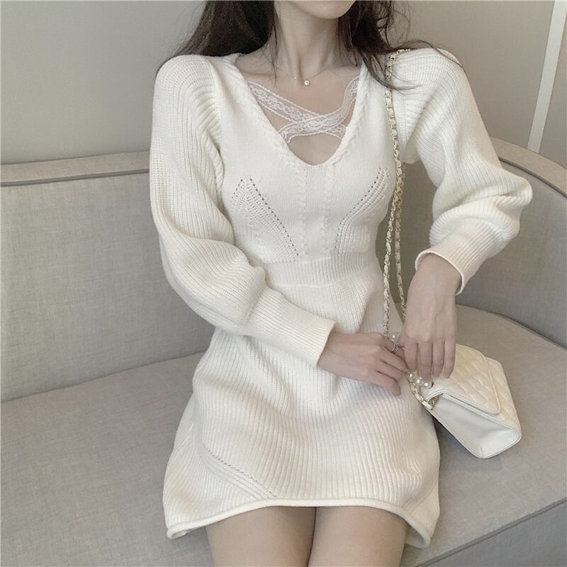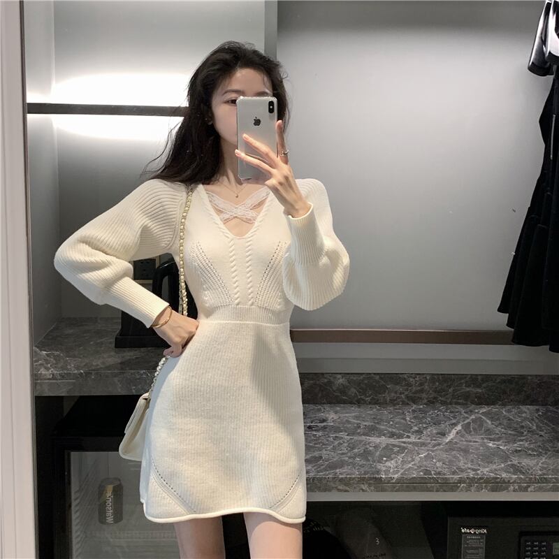 ホワイトVネックニットドレス オータムウェストAラインスカート ロング 秋物 フラワークラフター60784315048