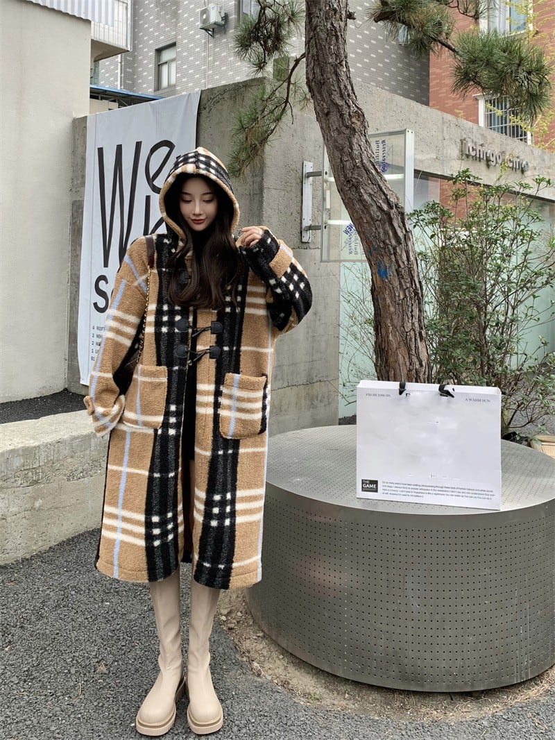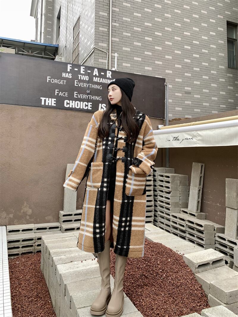 バックル格子柄フードジャケット レディースオータムウィンタースタイルルーズトップス 秋物 冬物 フラワークラフター32588368324