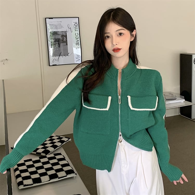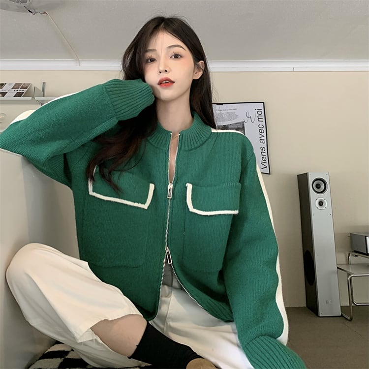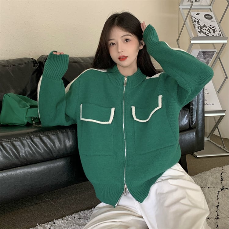 カラーダブルジッパーセーター ジャケット レディースオータムルーズニットカーディガン 秋物 フラワークラフター69577340068