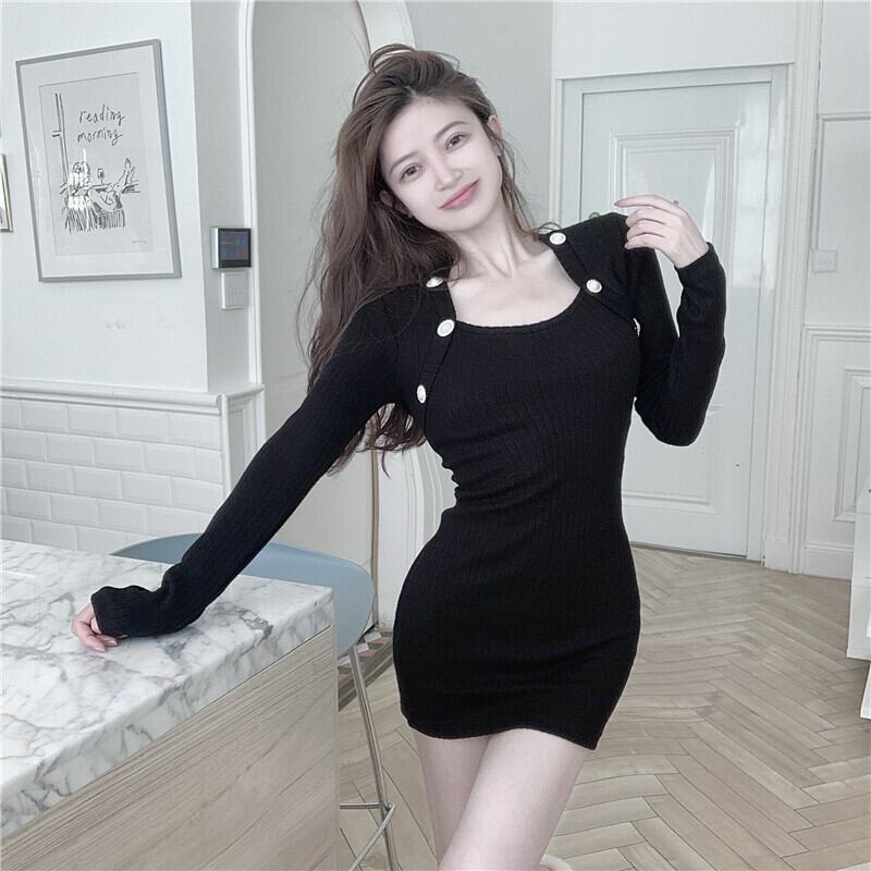 ブラックニットドレス オータムスカート カラーウェスト薄手 ロング 秋物 スクウェア フラワークラフター20381202757