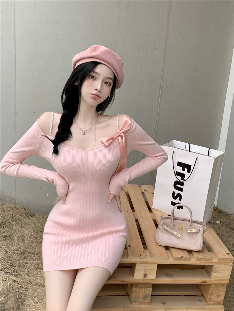 ニットドレス オータムスタイルストラップレスウェストスカート ピンク リボン 秋物 ピュア フラワークラフター68555866361