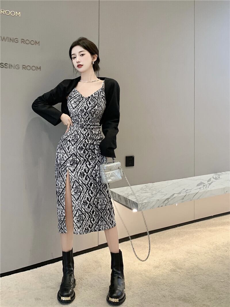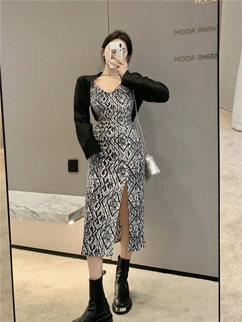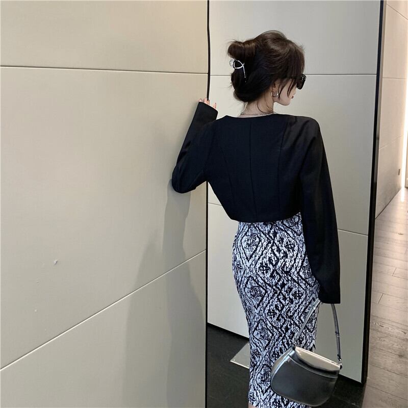 スタンダードドレス スプリングオータムVネックウェストスカート レトロ 春物 秋物 フラワークラフター85161971064