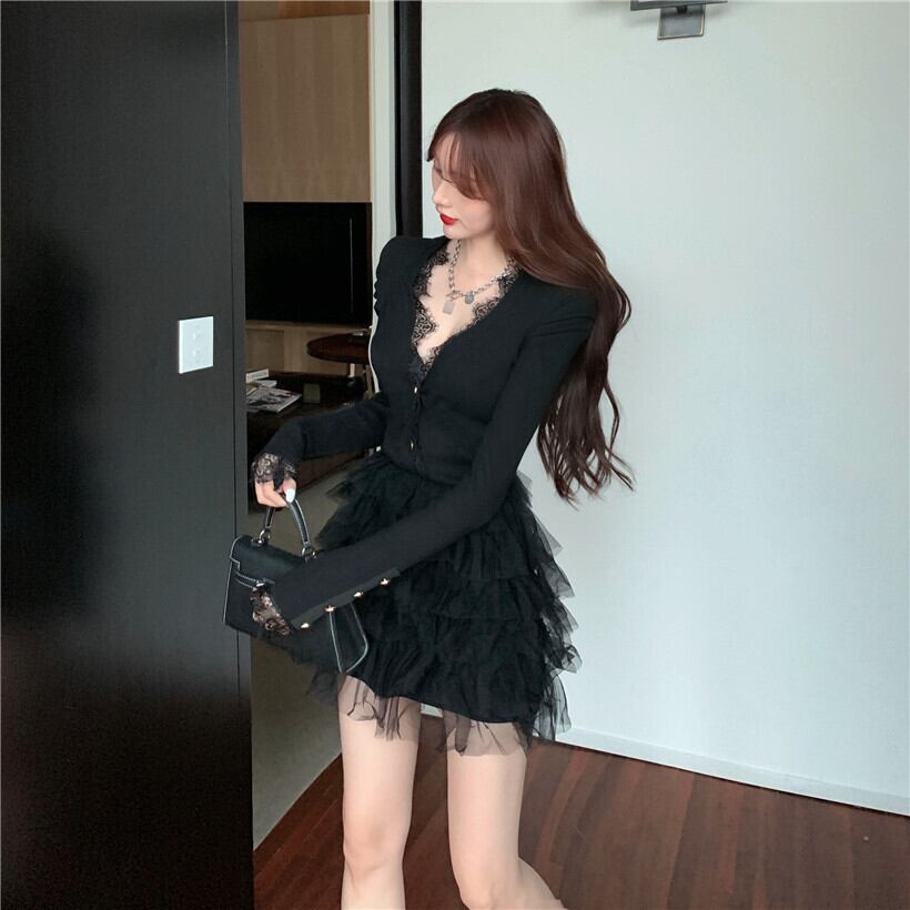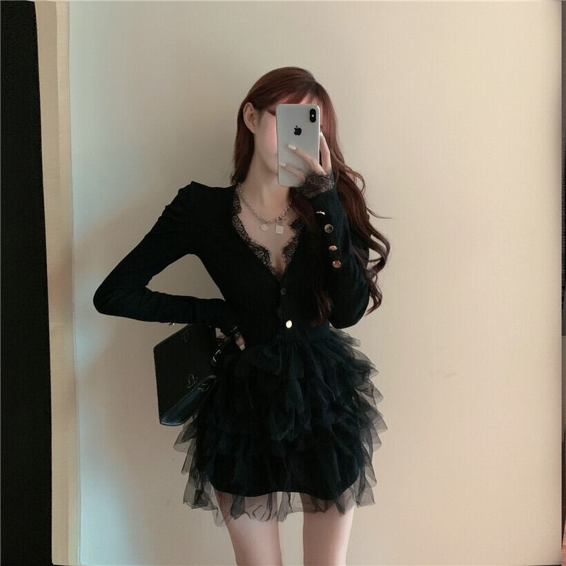 レースブラックVネックドレス オータムウェストスカート ロング 秋物 ステッチ フラワークラフター99817588575