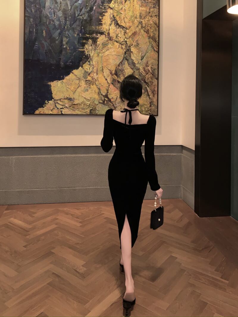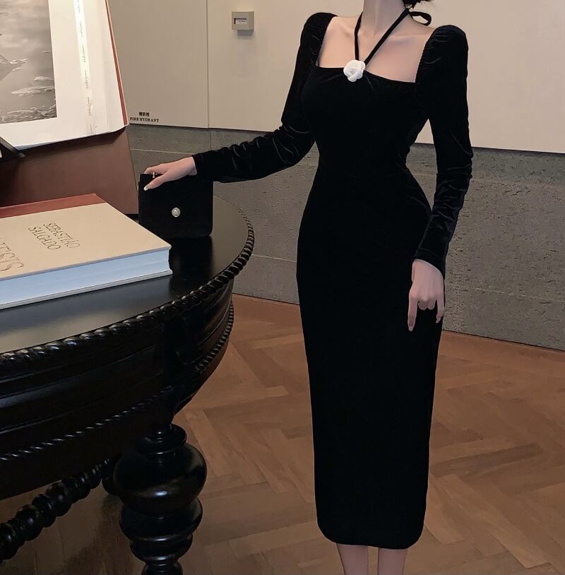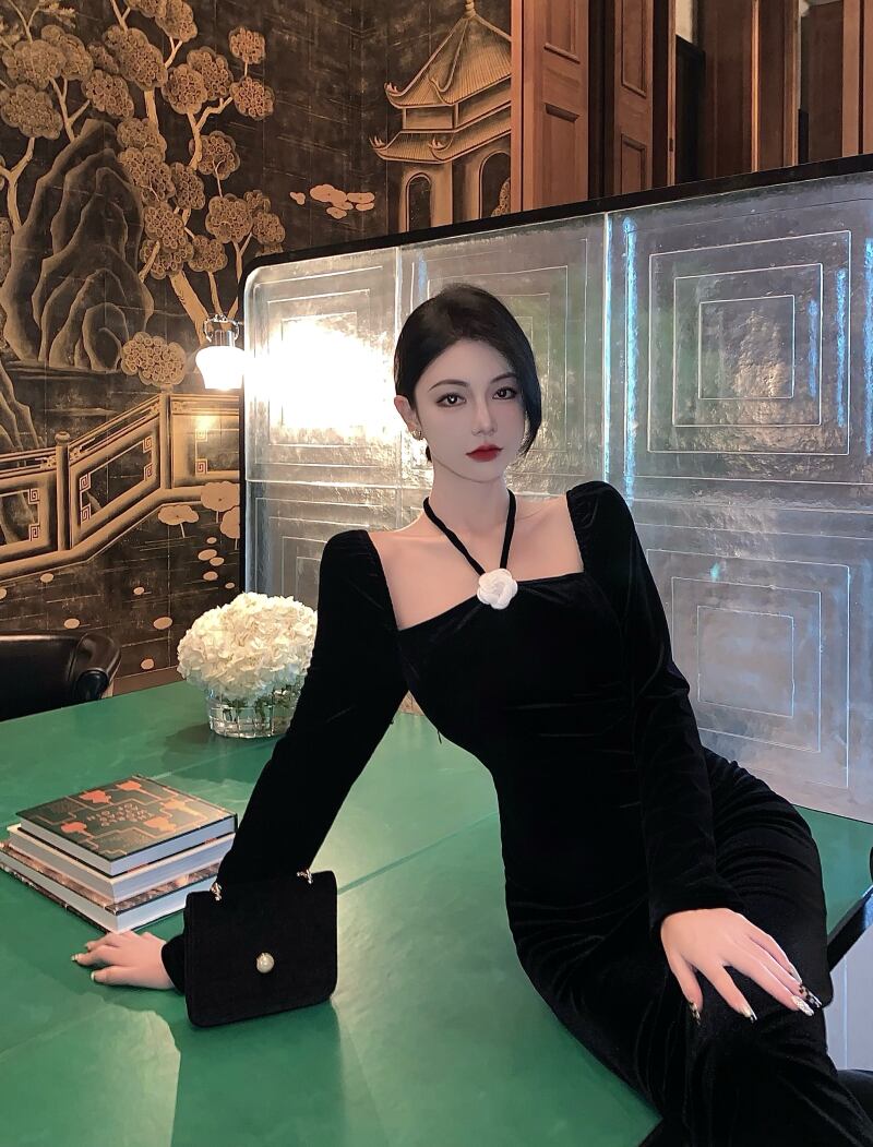 Flowerデザイン ベルベットドレス オータムスタイルウェストブラック 秋物 フラワーデザイン フラワークラフター69791889502